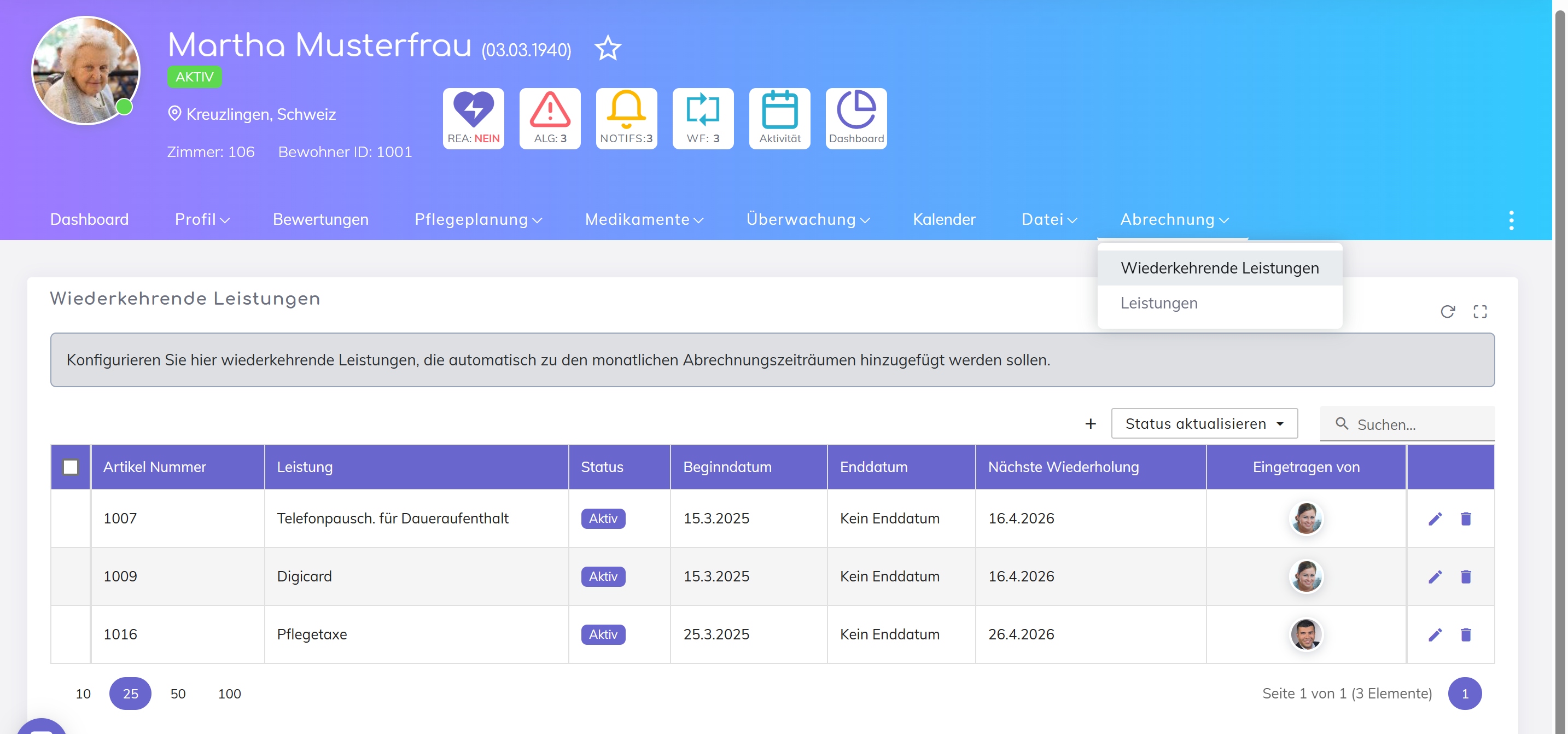 Die erzeugten Einträge können im Bewohnerprofil eingesehen und bei Bedarf bearbeitet werden.