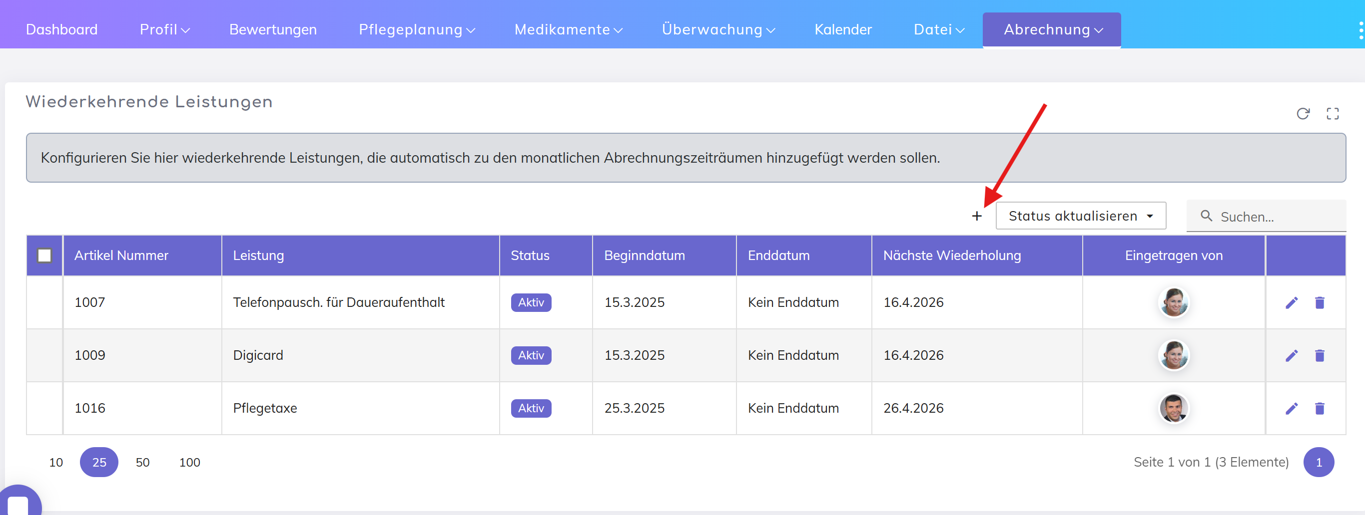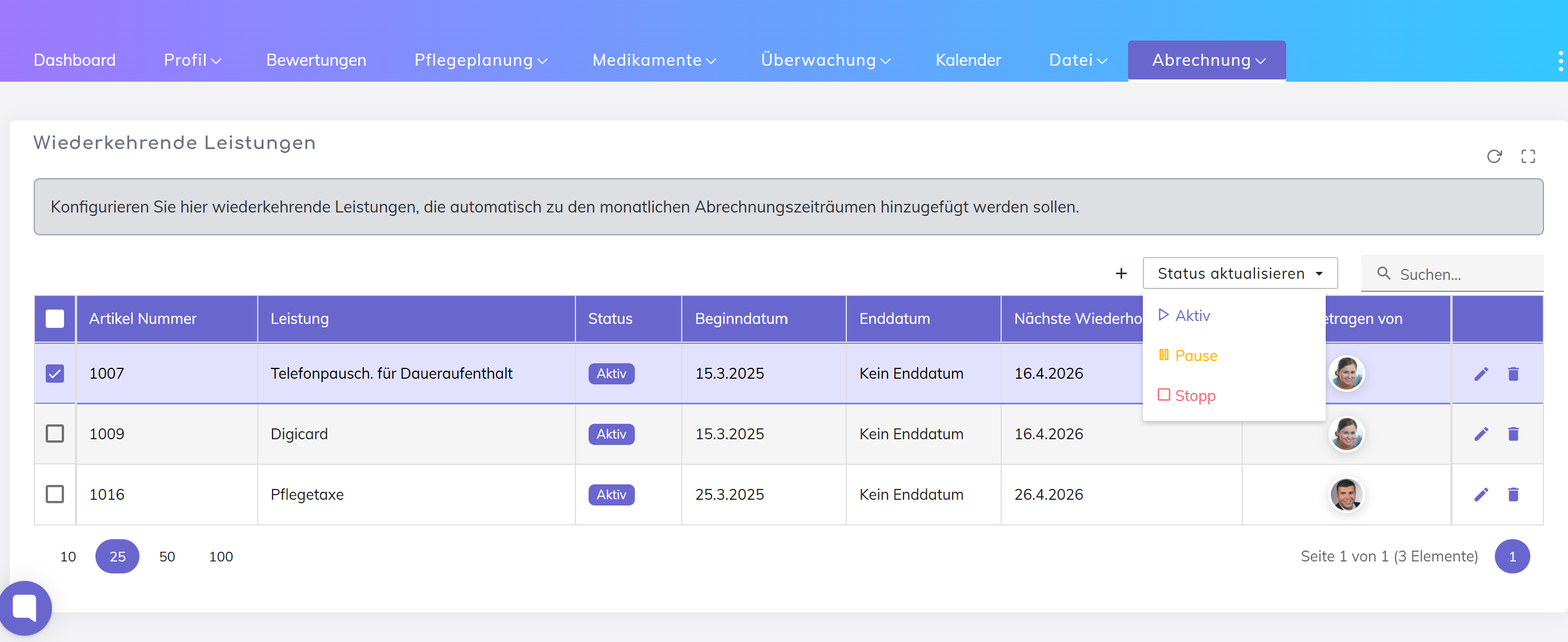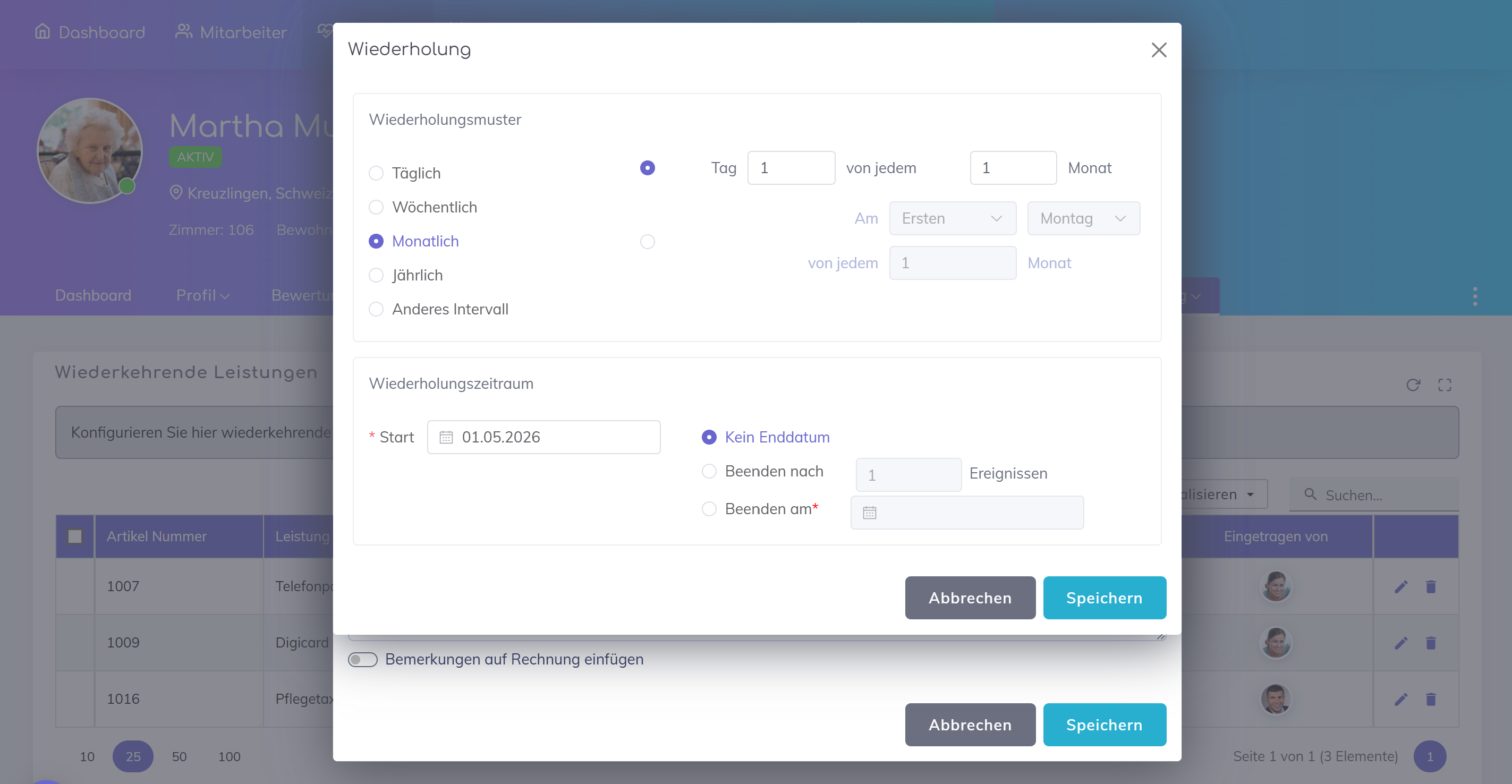 Automatische AbrechnungNach der Einrichtung wird die Leistung automatisch gemäß dem definierten Intervall zur Abrechnung hinzugefügt.