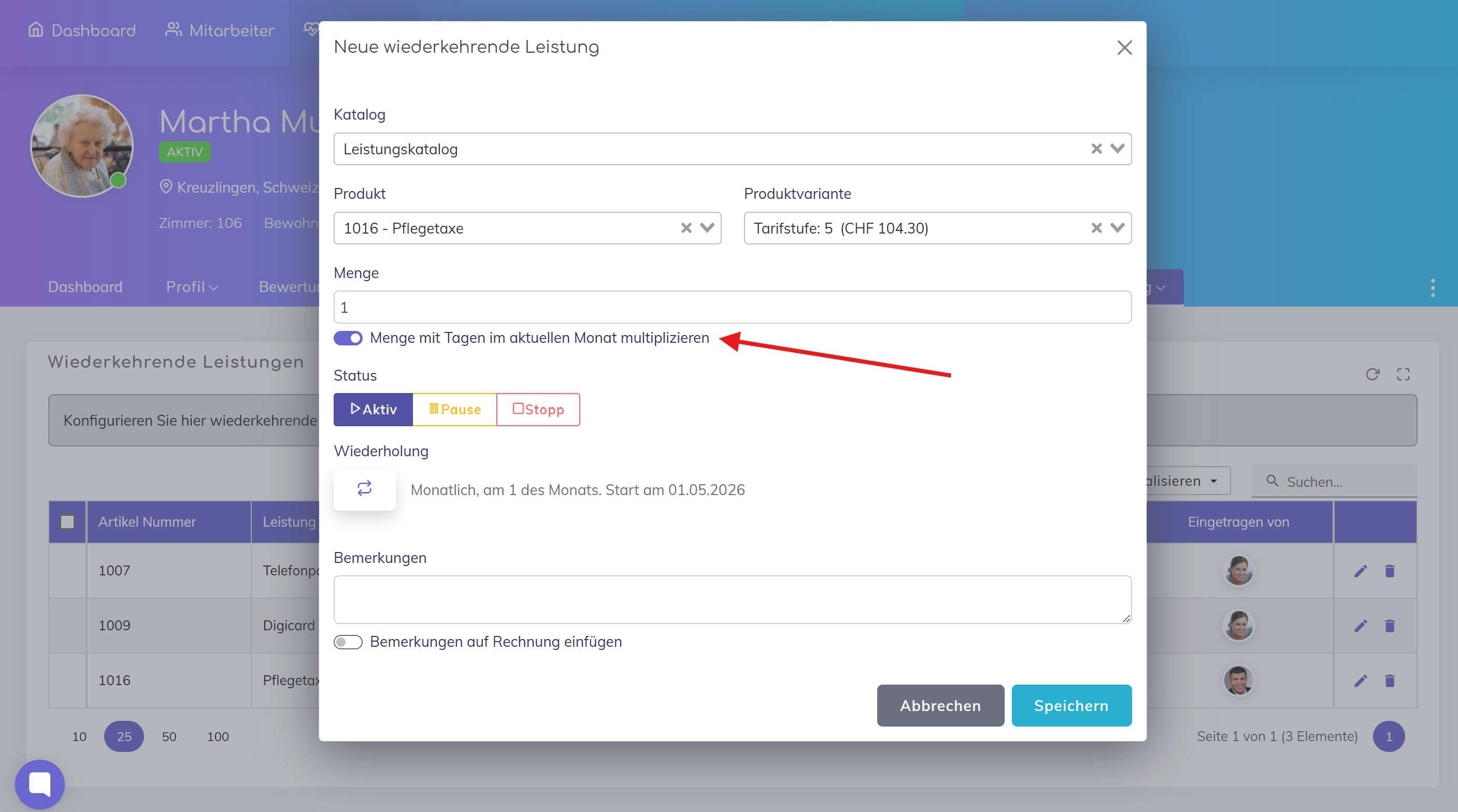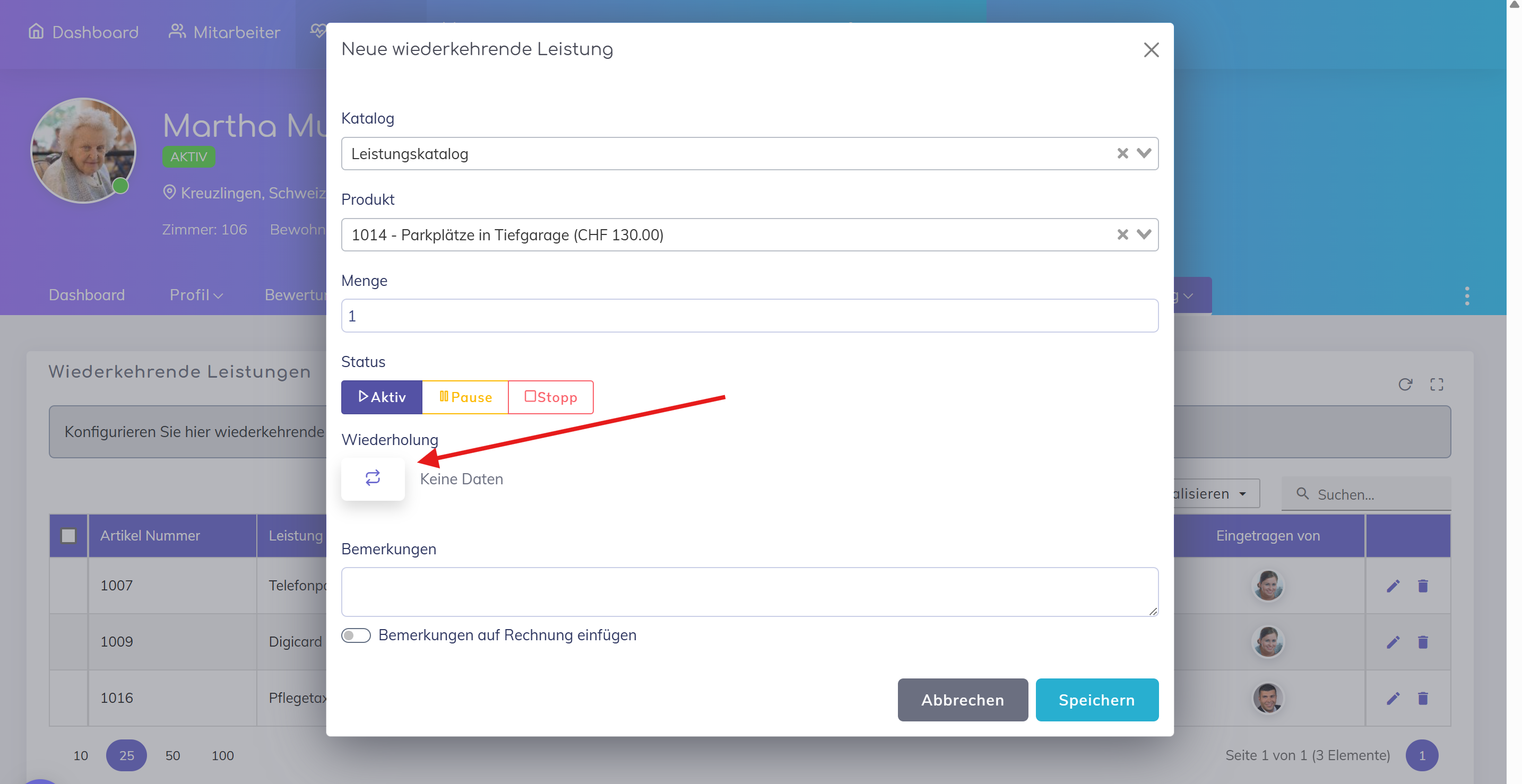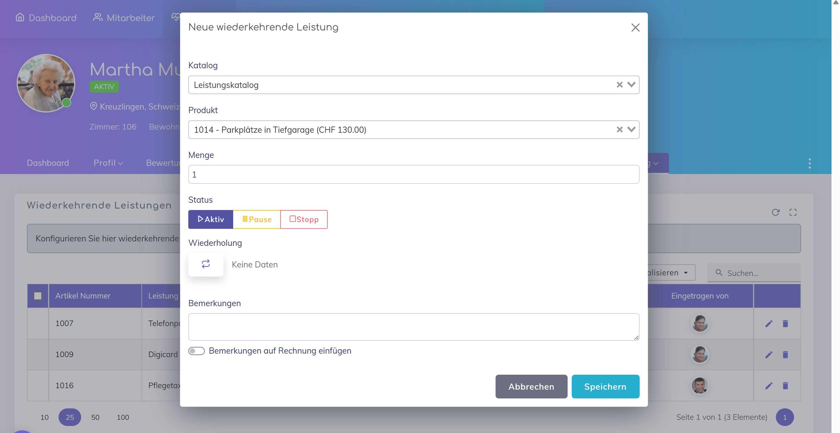 Füge eine Leistung direkt aus dem Bewohnerprofil zur Abrechnungsliste hinzu.