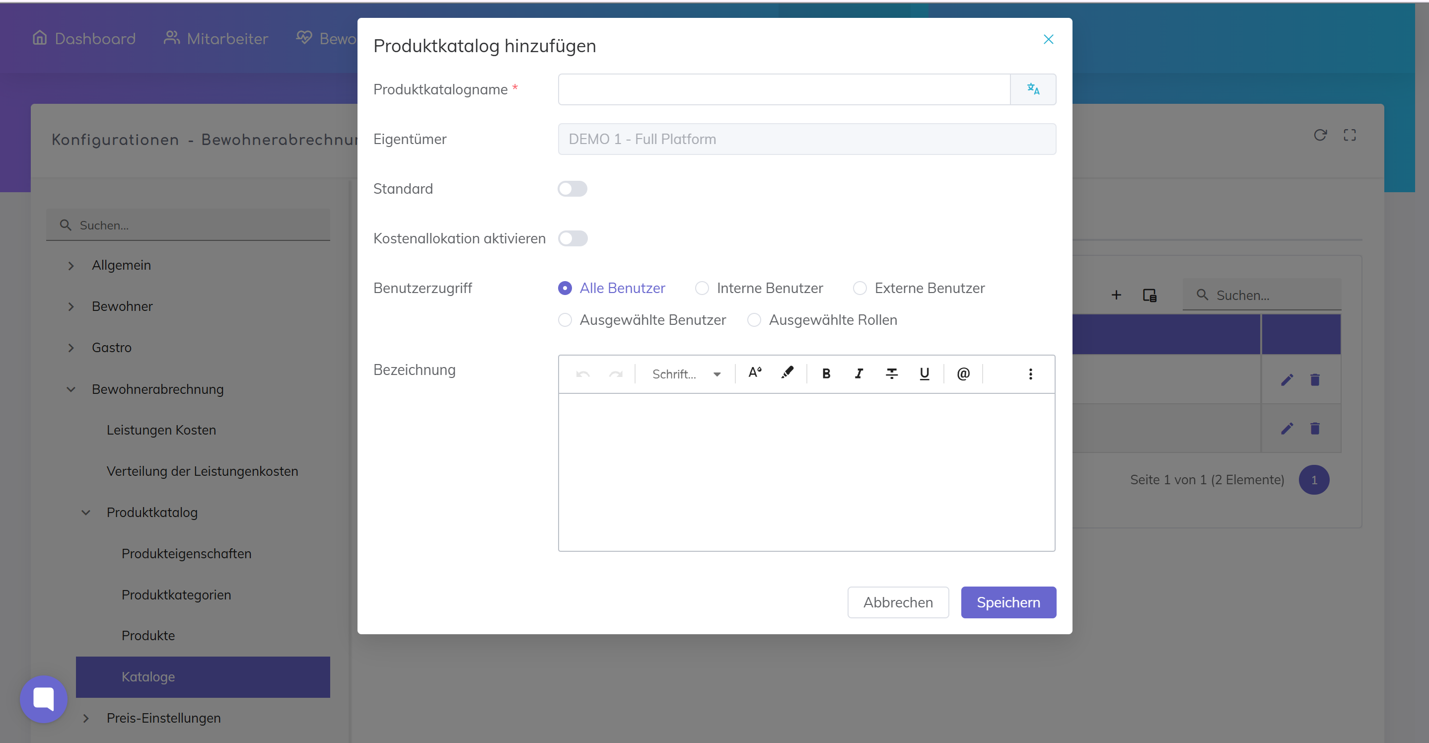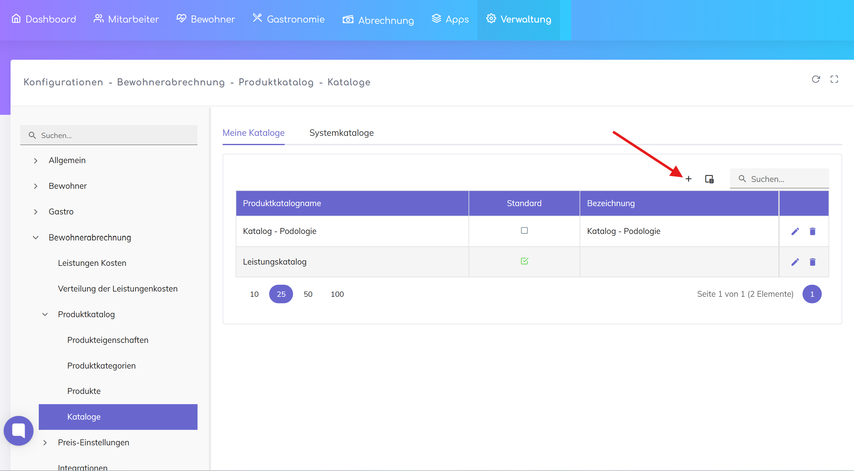 Verwaltung → Konfigurationen → Bewohnerabrechnung → Produktkatalog → Kataloge