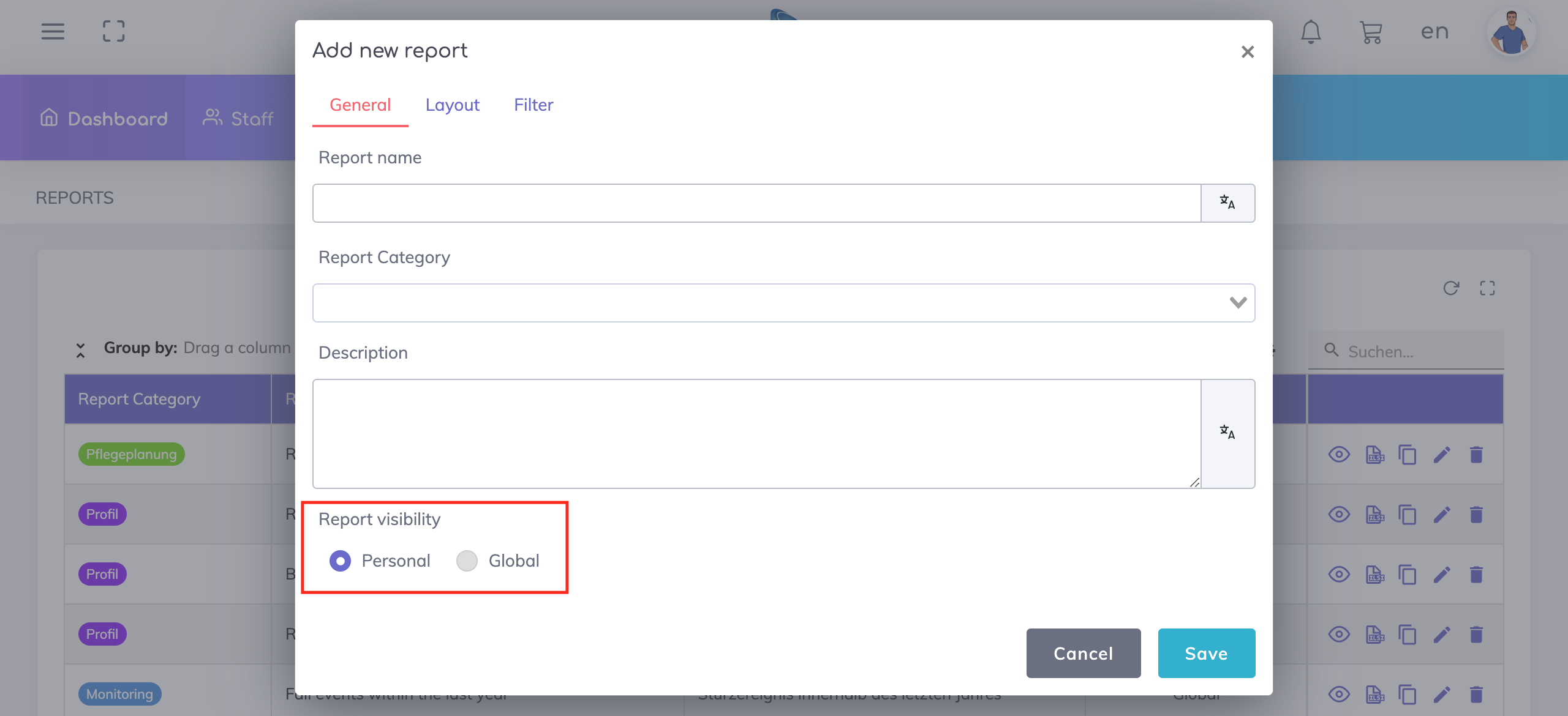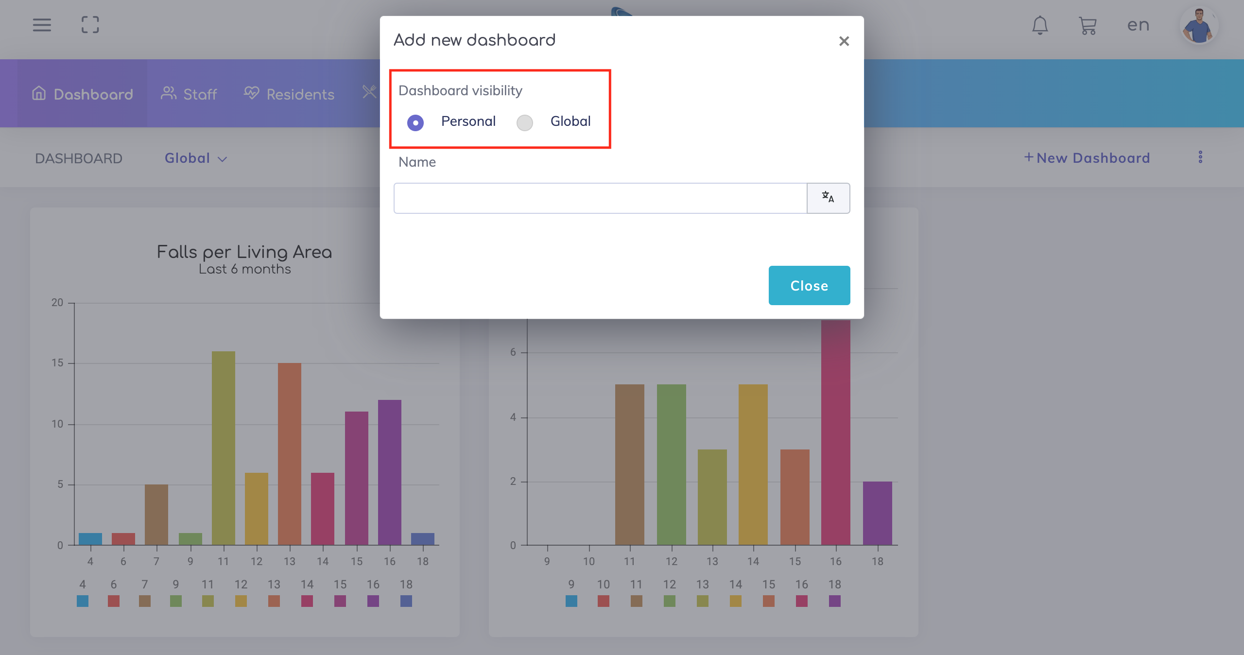 Es gibt zwei Arten von Dashboards und Berichten: persönlich oder global.
