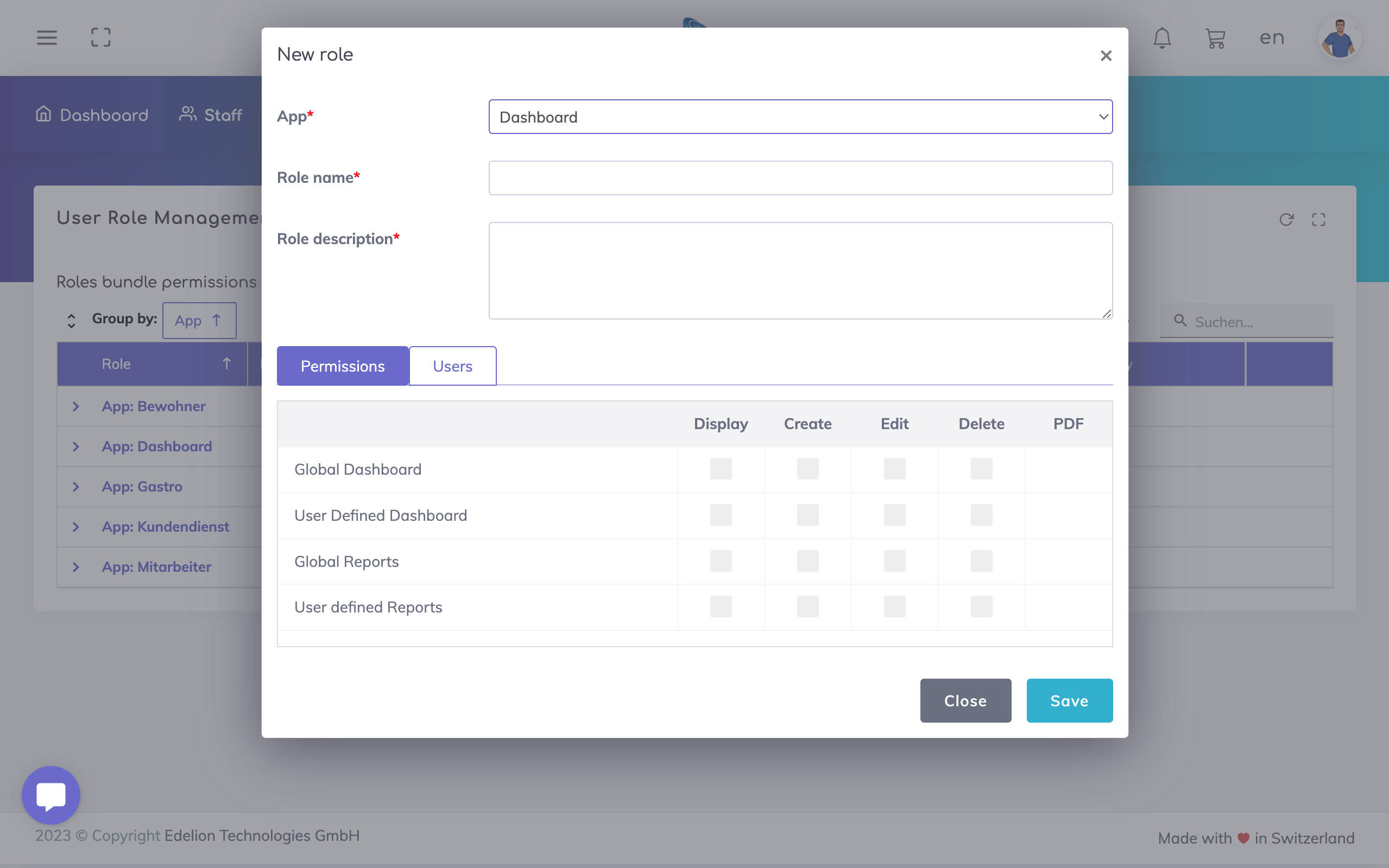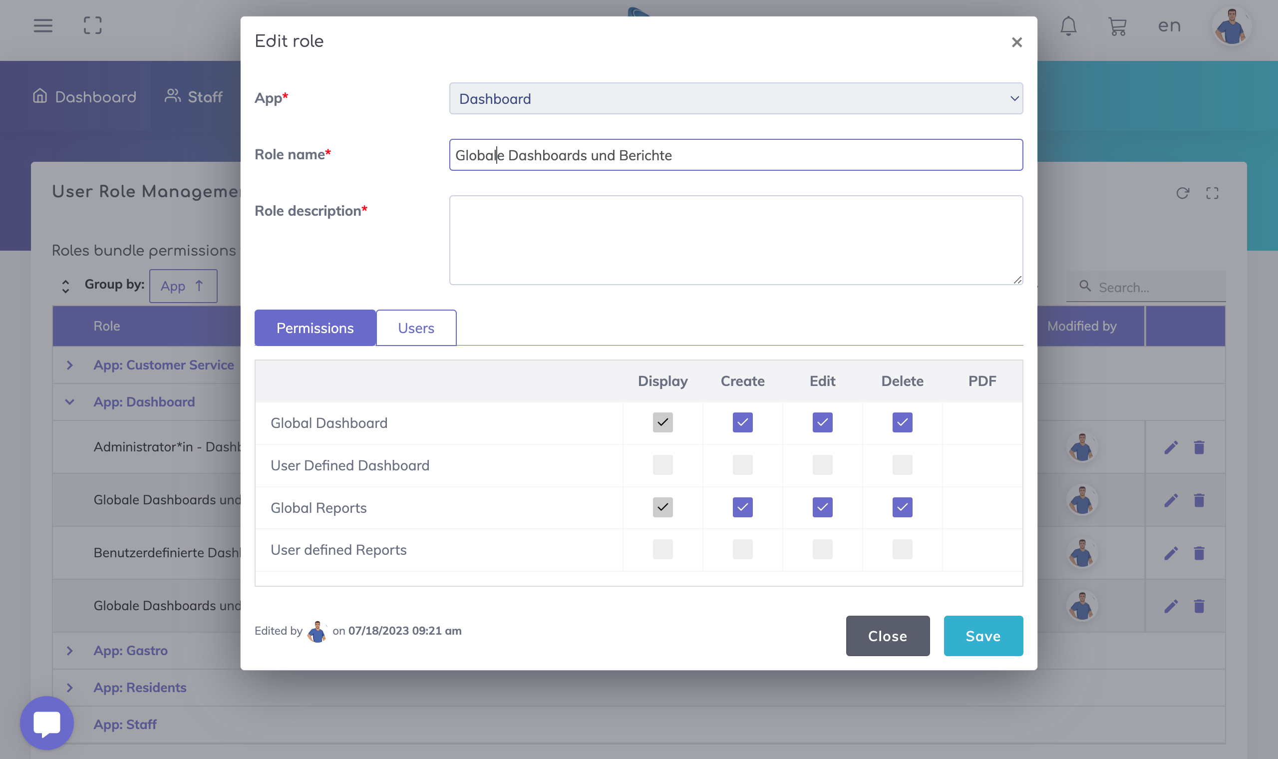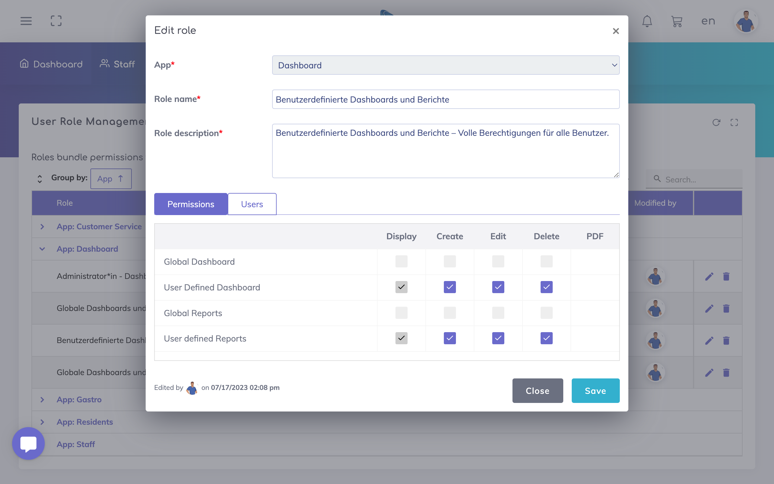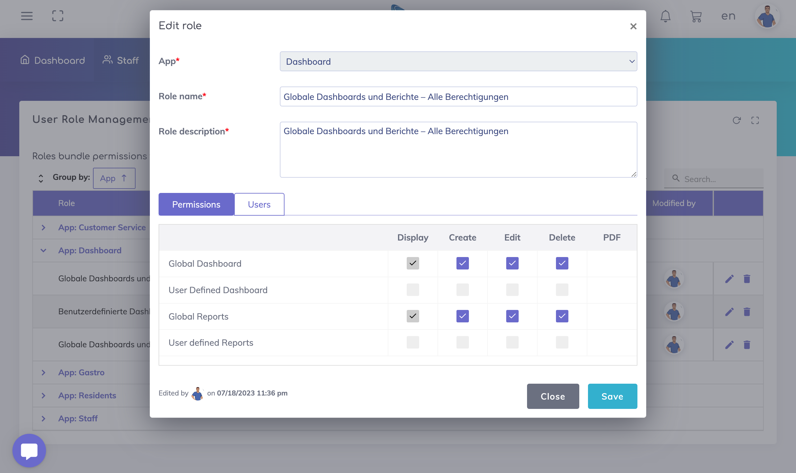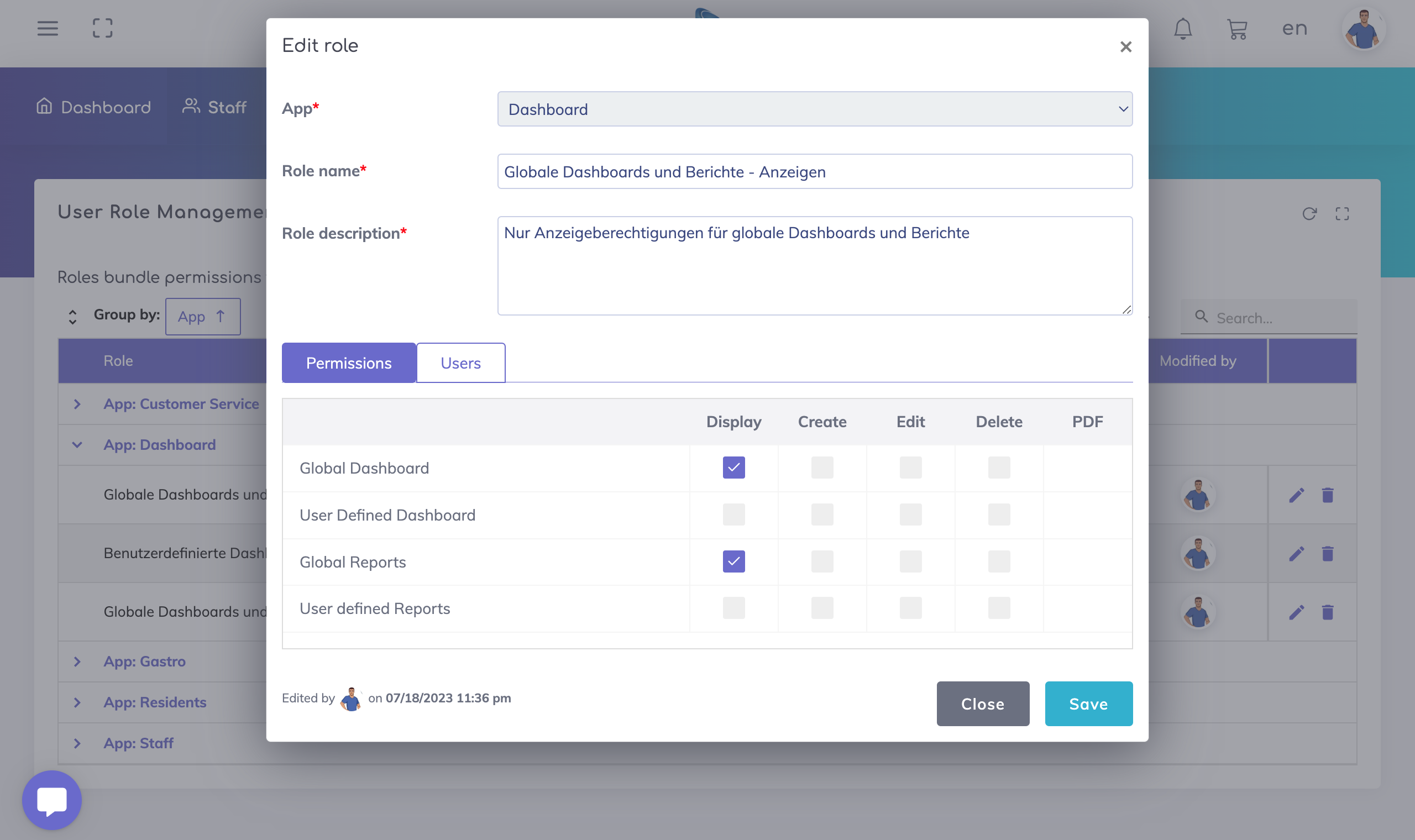 Die Benutzerrolle für die Dashboard-App umfasst die Berechtigungen zum Anzeigen, Erstellen, Bearbeiten und Löschen für Dashboards und Berichte.