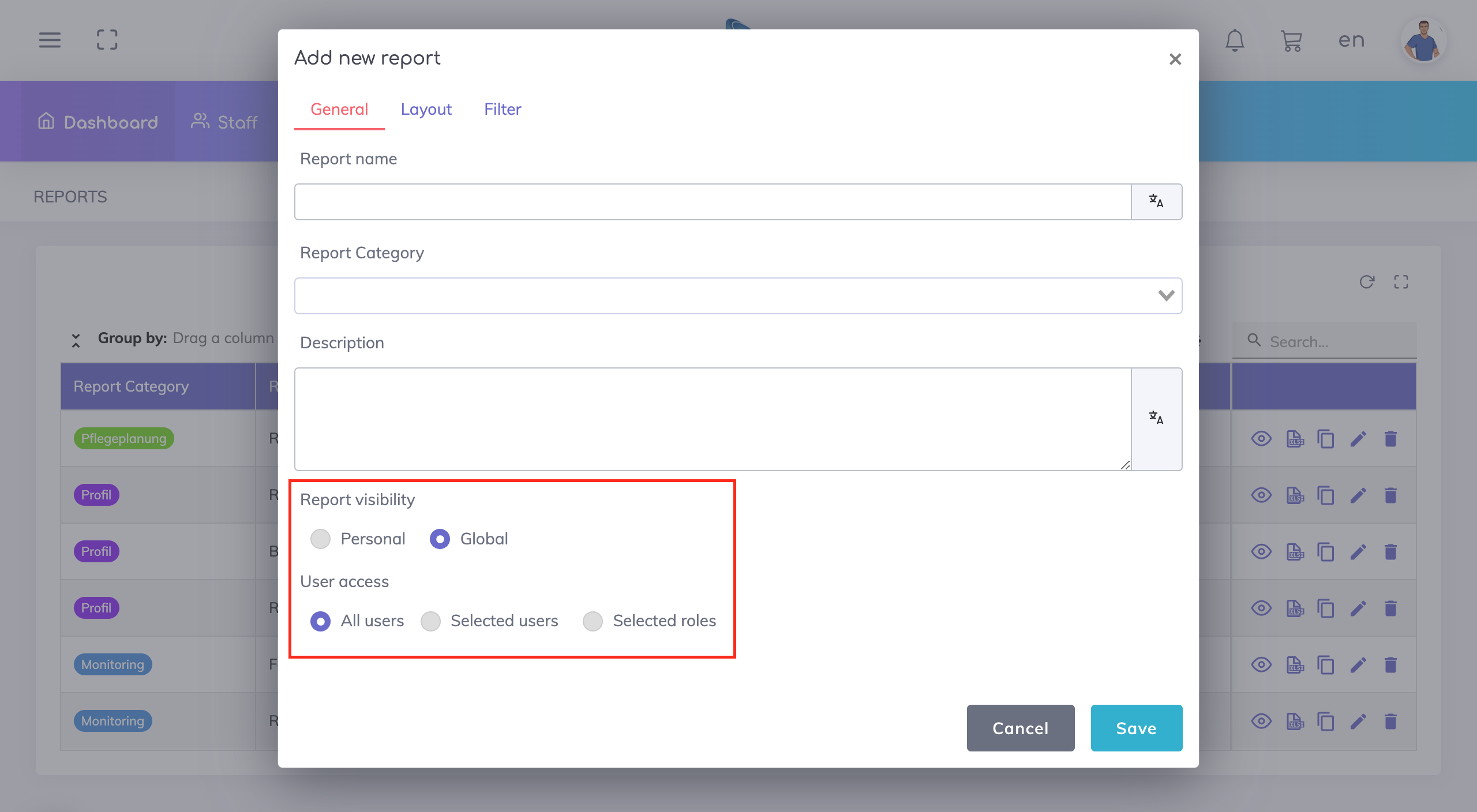 Somit ist es mit globalen Berichten möglich, allen Benutzern, ausgewählten Benutzern oder Benutzern mit ausgewählten Rollen Zugriff auf einen bestimmten Bericht zu gewähren.