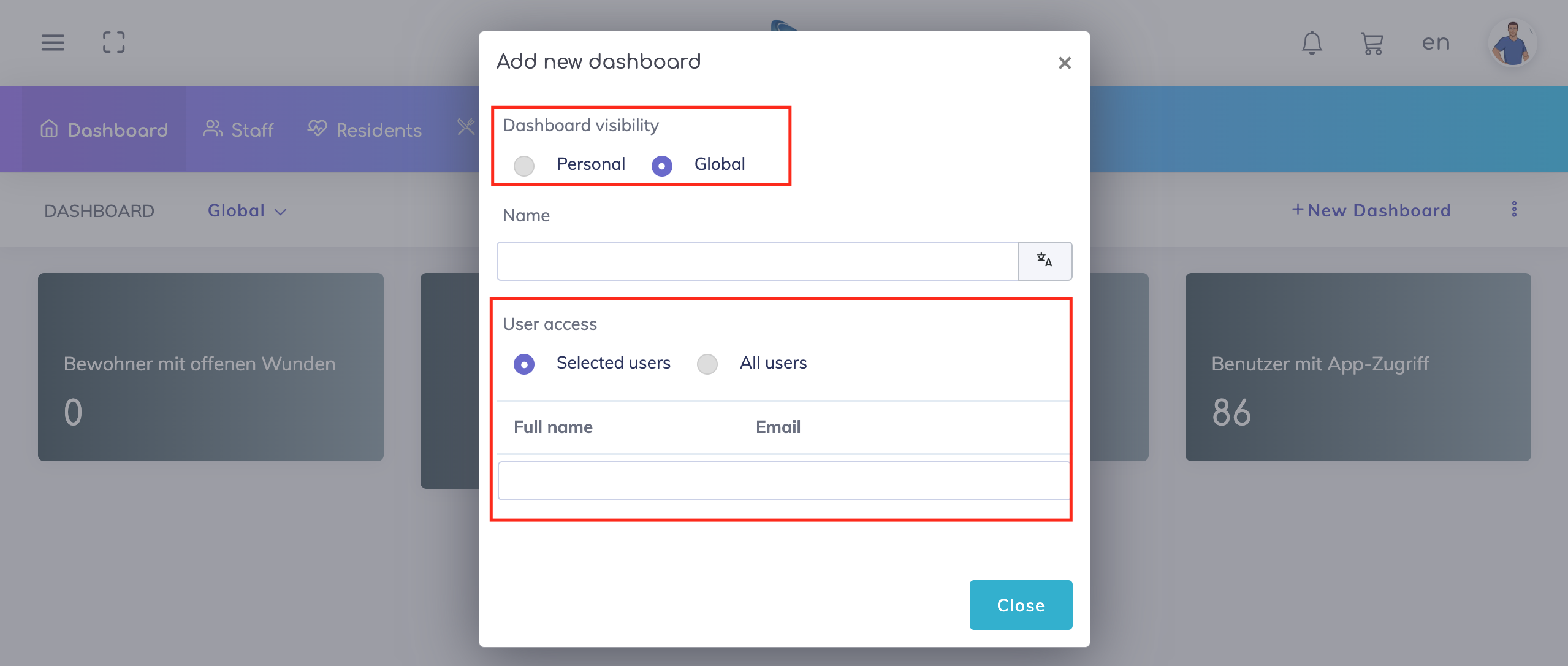 Ebenso ist es bei globalen Dashboards möglich, allen Benutzern oder ausgewählten Benutzern Zugriff auf ein bestimmtes Dashboard zu gewähren.