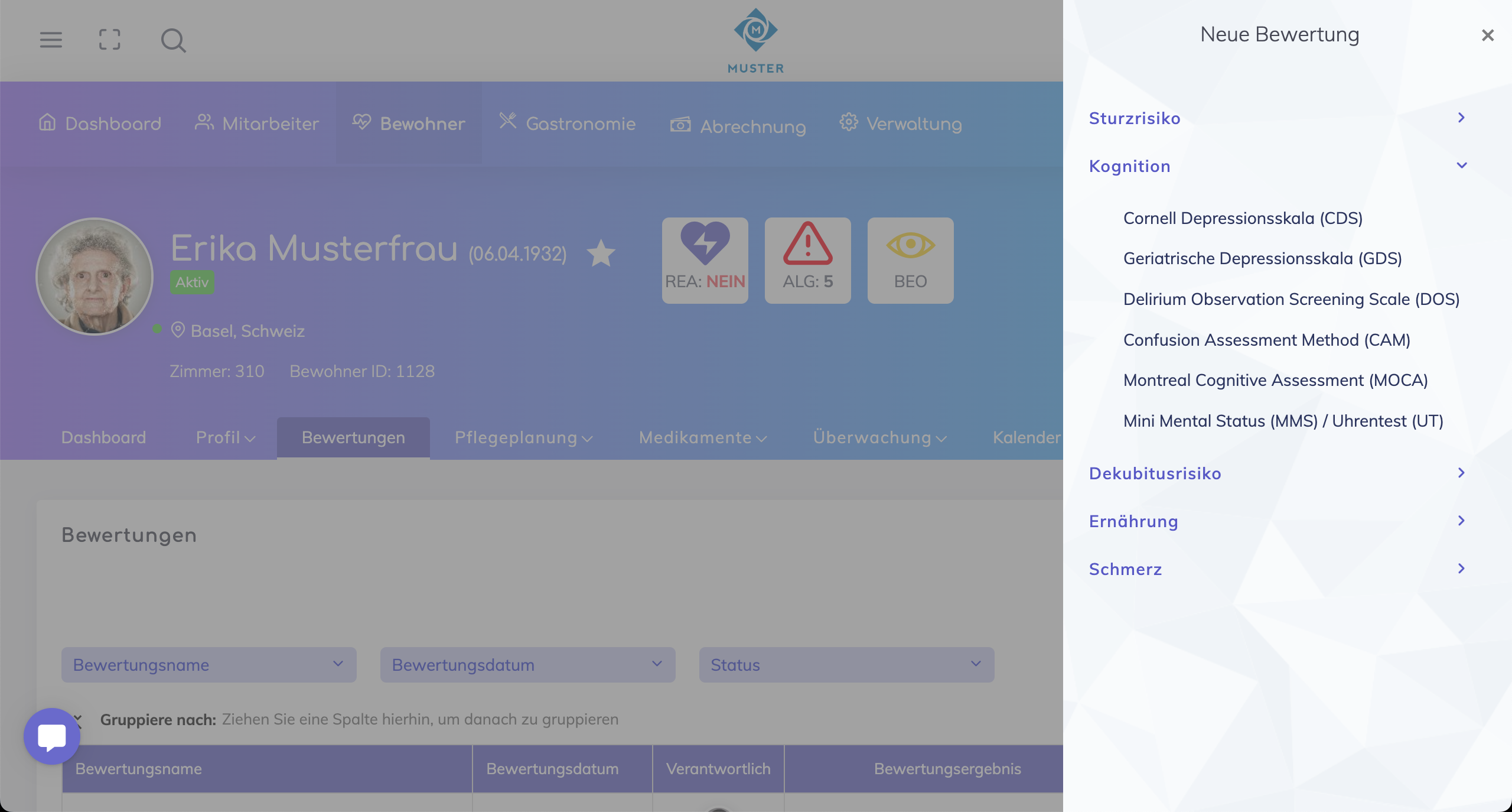 Die aktiven Assessments werden angezeigt, wenn Sie im Abschnitt „Bewertungen“ eine neue Assessment für einen Bewohner hinzufügen.
