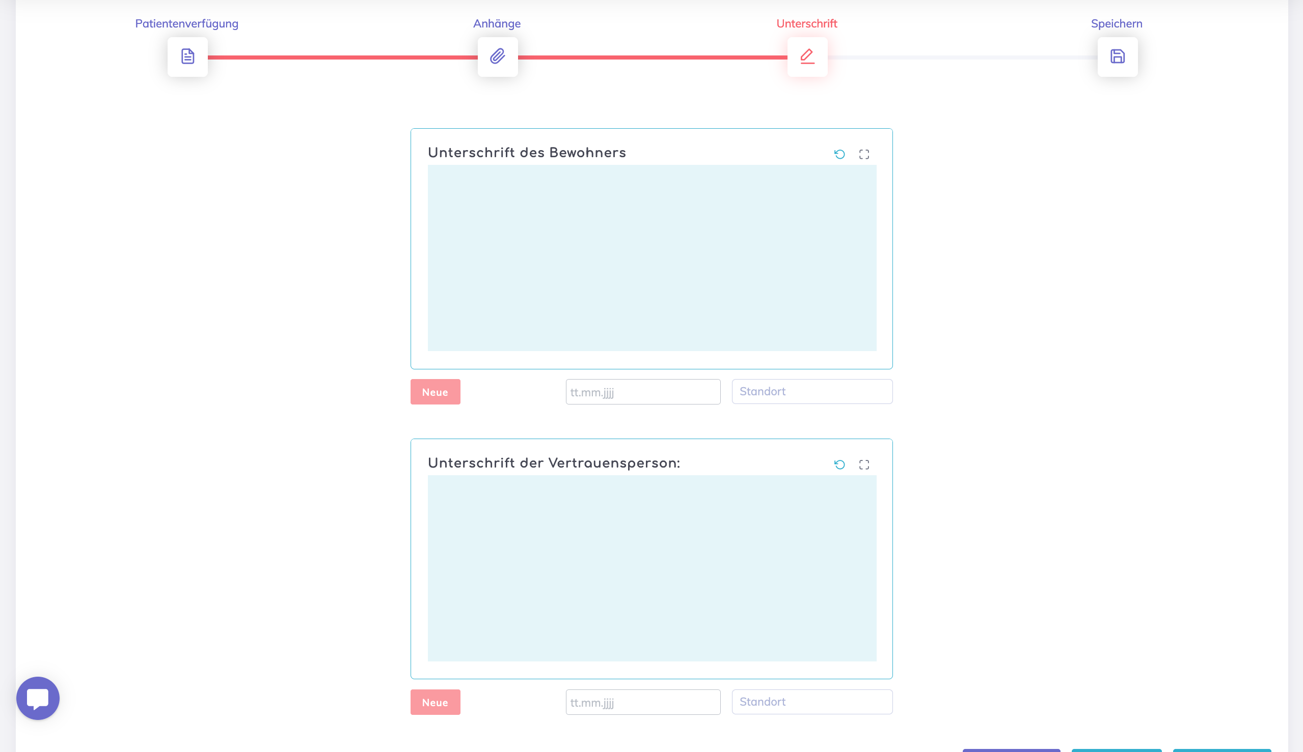 Standardmässig gibt es für den Bewohner immer einen Unterschriftenbereich mit Datums- und Ortsfeld. Die zuvor erstellten Signaturen werden angezeigt und bei Bedarf kann durch Klicken auf die Schaltfläche „Neu“ eine neue Signatur erstellt werden.