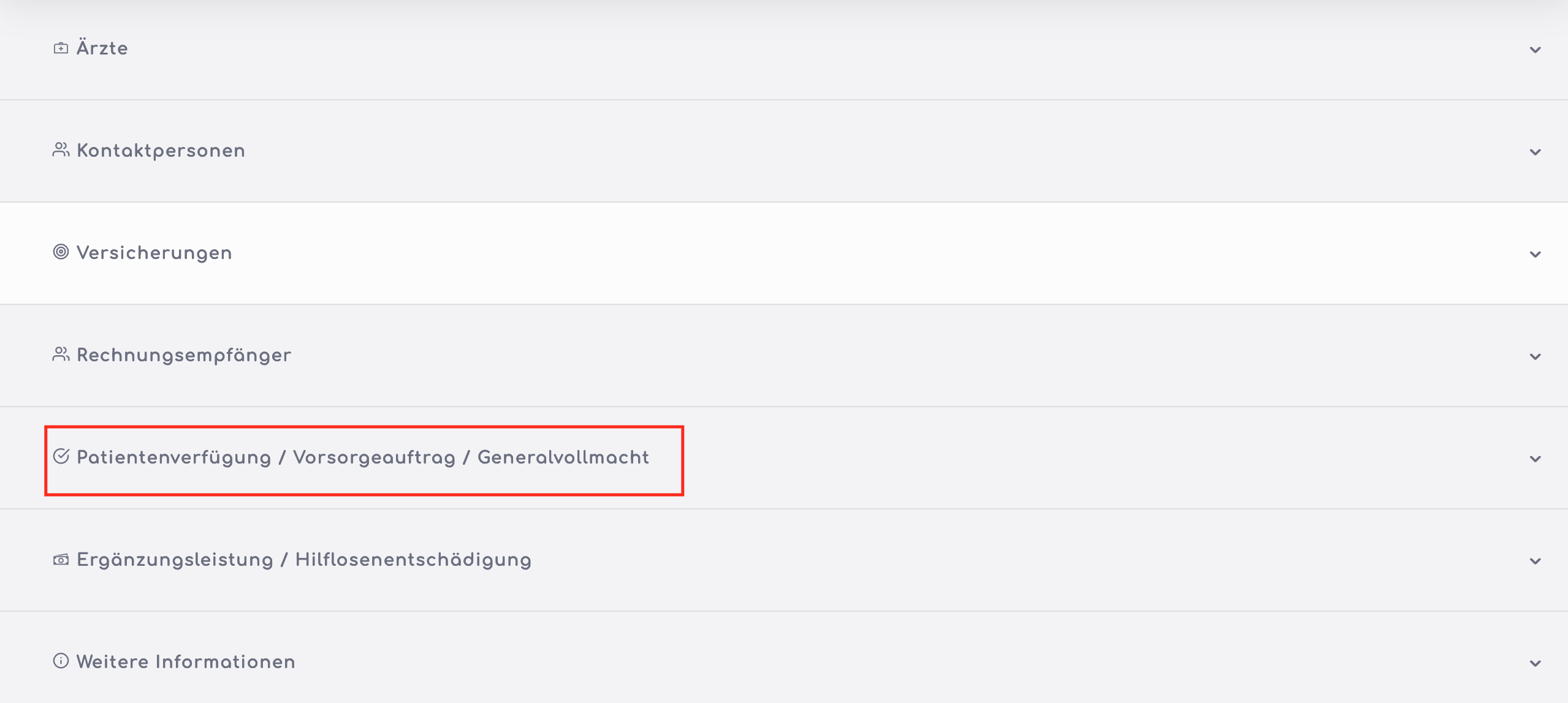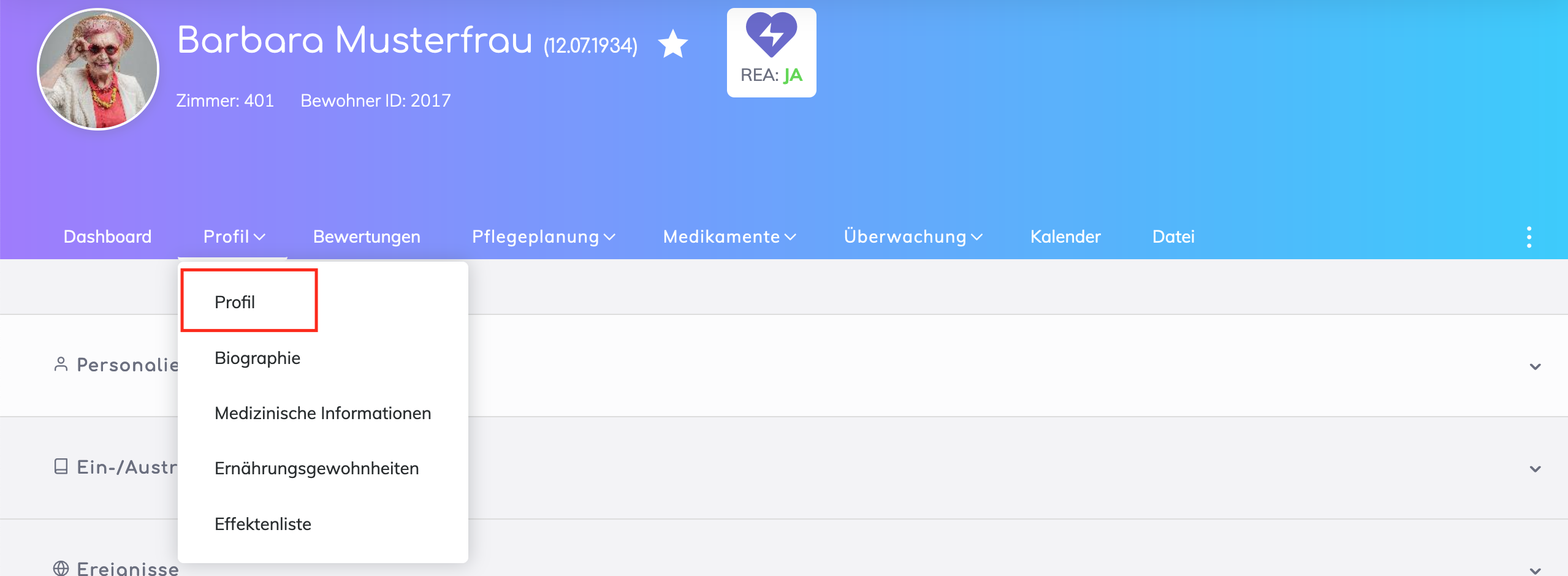 Die Patientenverfügung ist im Abschnitt „Profil“ der Bewohnerakte verfügbar.
