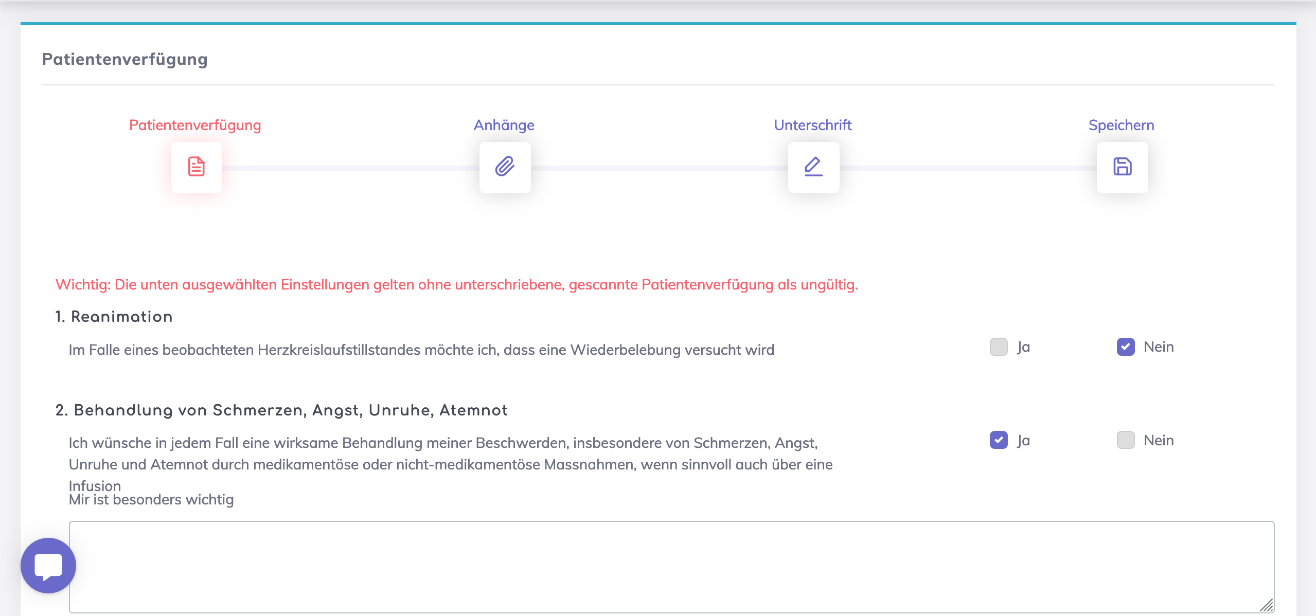Speichern – Beim Speichern des Formulars werden die Unterschriften auf dem Übersichtsbildschirm angezeigt und sind auch beim Exportieren der Patientenverfügung als PDF verfügbar.