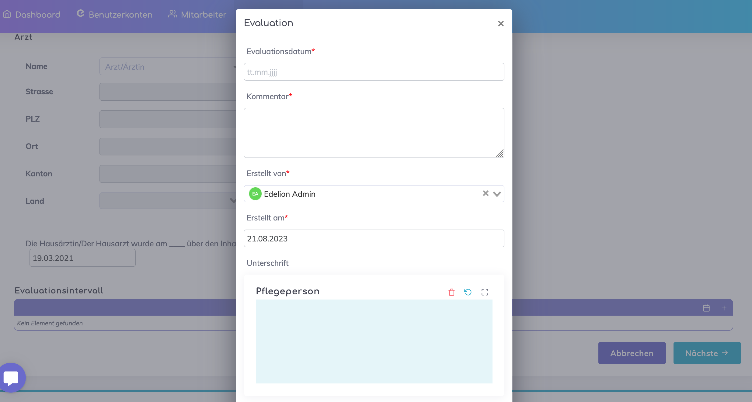 Die einzelnen Evaluationen können durch einen Klick auf das +-Symbol hinzugefügt werden. Pflegepersonen können bei der Durchführung der Evaluationen ihre Unterschrift hinzufügen. Abhängig vom Ergebnis der Evaluation kann das Formular im 3. Schritt des Assistenten vom Patienten und der Vertrauensperson erneut unterschrieben werden.