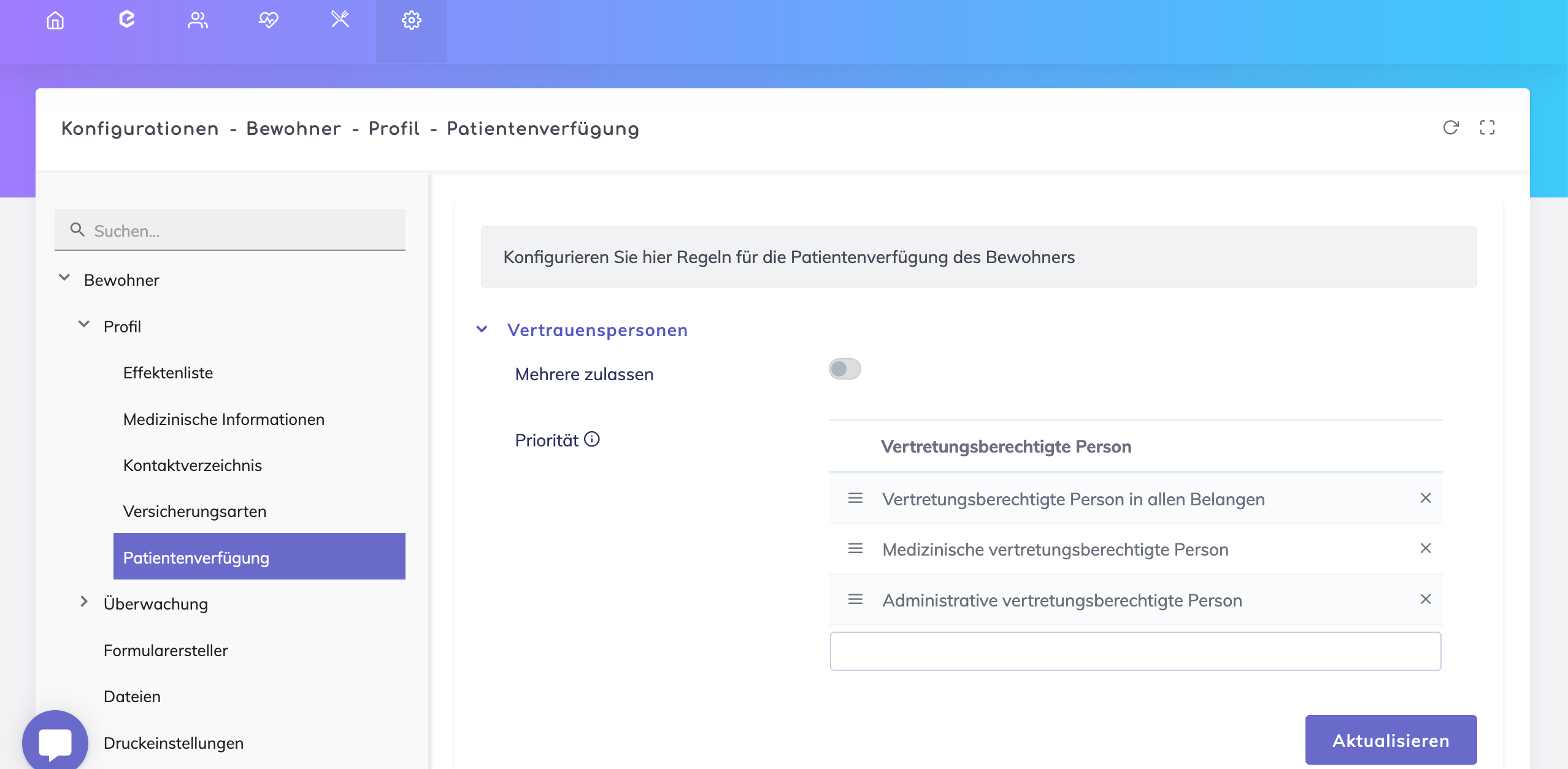 Abhängig von der vorgenommenen Konfiguration ist es möglich, entweder eine einzelne oder mehrere Vertrauenspersonen einzugeben (gehen Sie zu Verwaltung > Konfigurationen > Bewohner > Profil > Patientenverfügung).