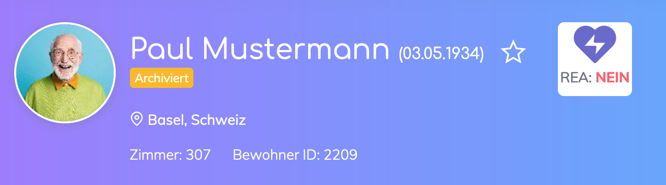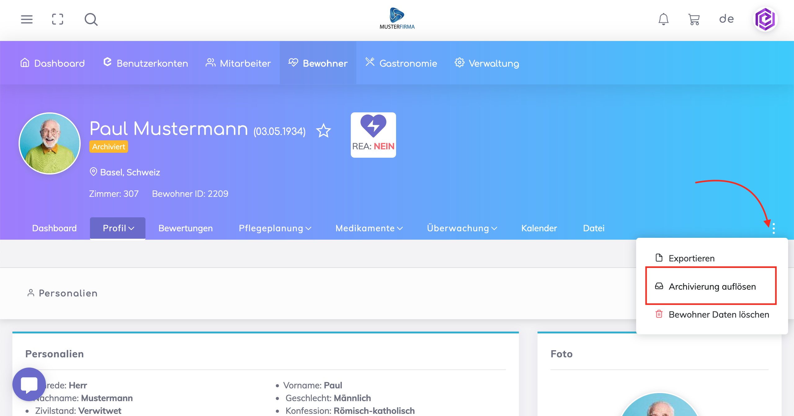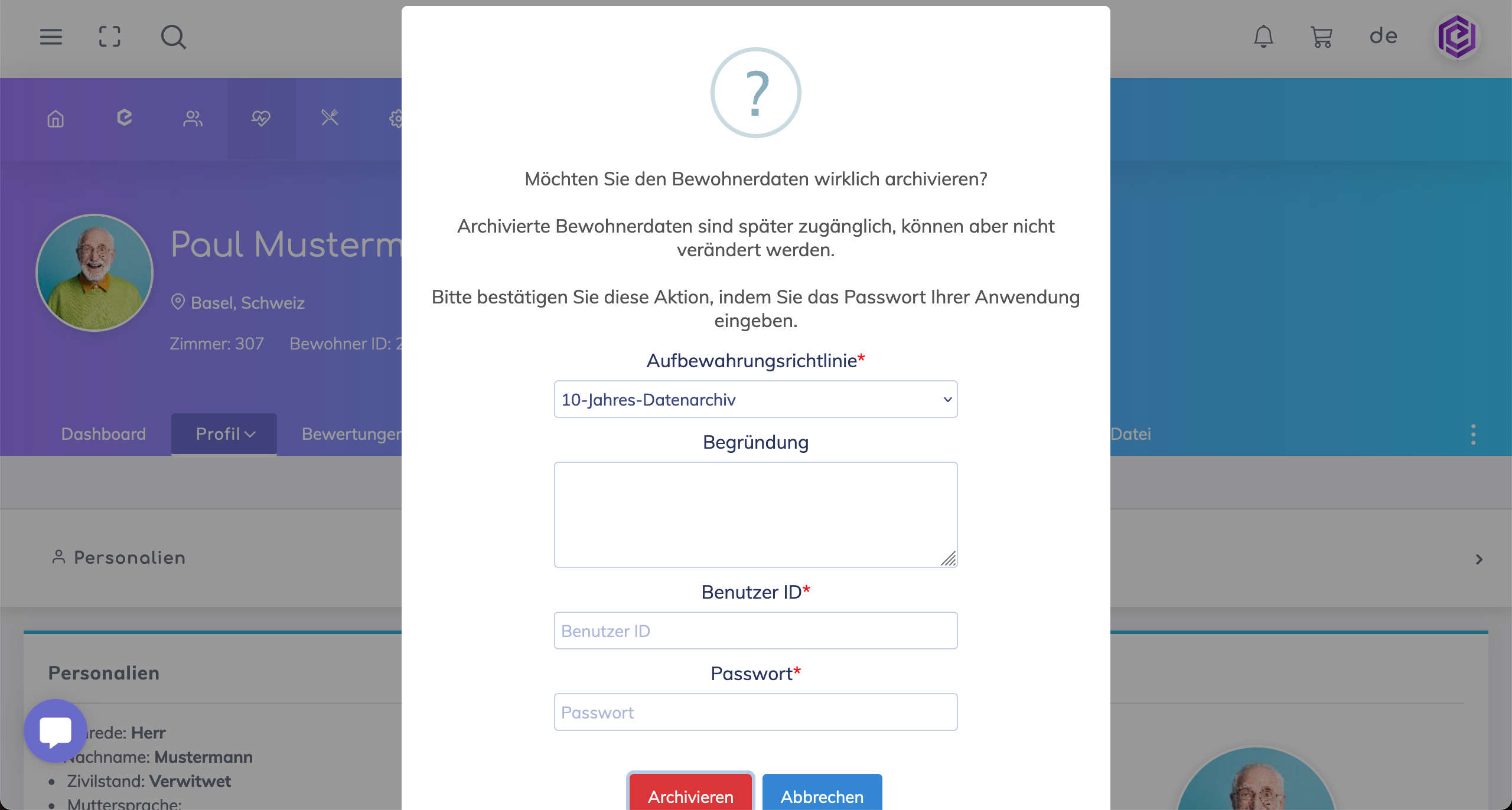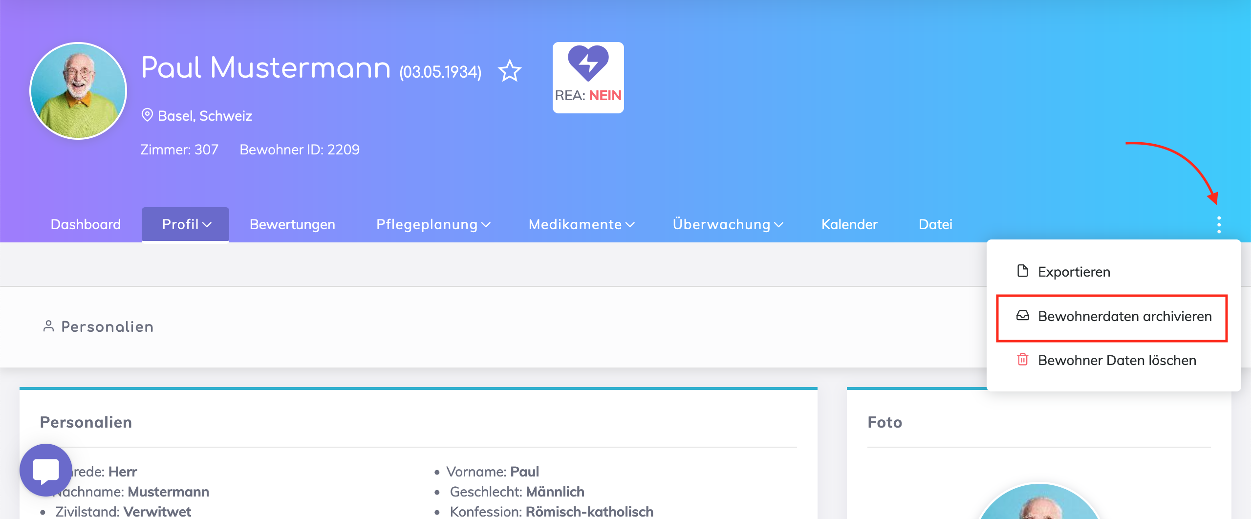 Die Option zum Archivieren eines Bewohnerdatensatzes ist wie unten dargestellt.