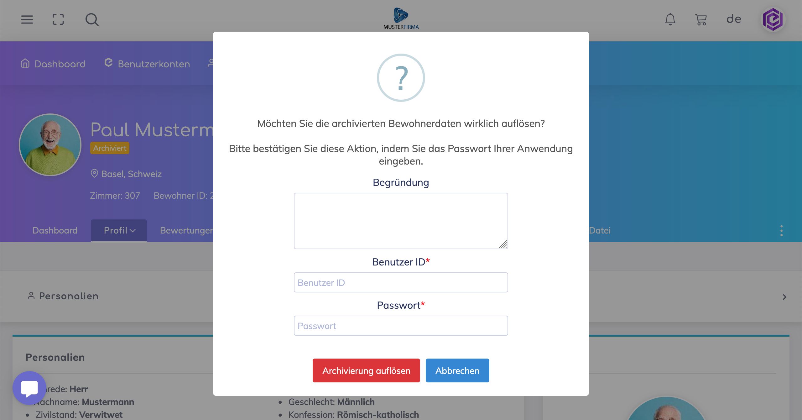 Durch diese Aktion werden die Bewohnerdaten nicht gelöscht. Durch diese Aktion wird der Datensatz aus dem Archiv entfernt und der Status des Bewohners zurück auf „Aktiv“, „Inaktiv“ oder „Verstorben“ verschoben.