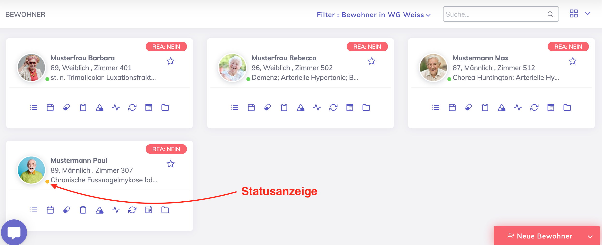 In der Bewohnerliste zeigt die gelbe Statusfarbe an, dass sich der Bewohnerdatensatz im Archiv befindet.