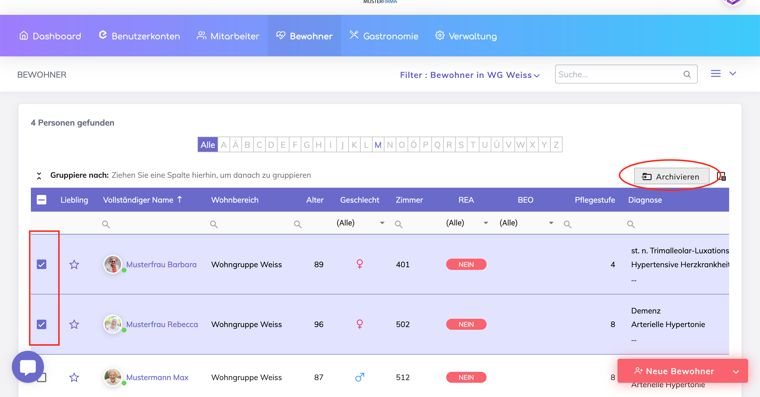 Um mehrere Datensätze gleichzeitig zu archivieren, gehen Sie zur Listenansicht, wählen Sie die Bewohner aus und klicken Sie auf Archivieren.
