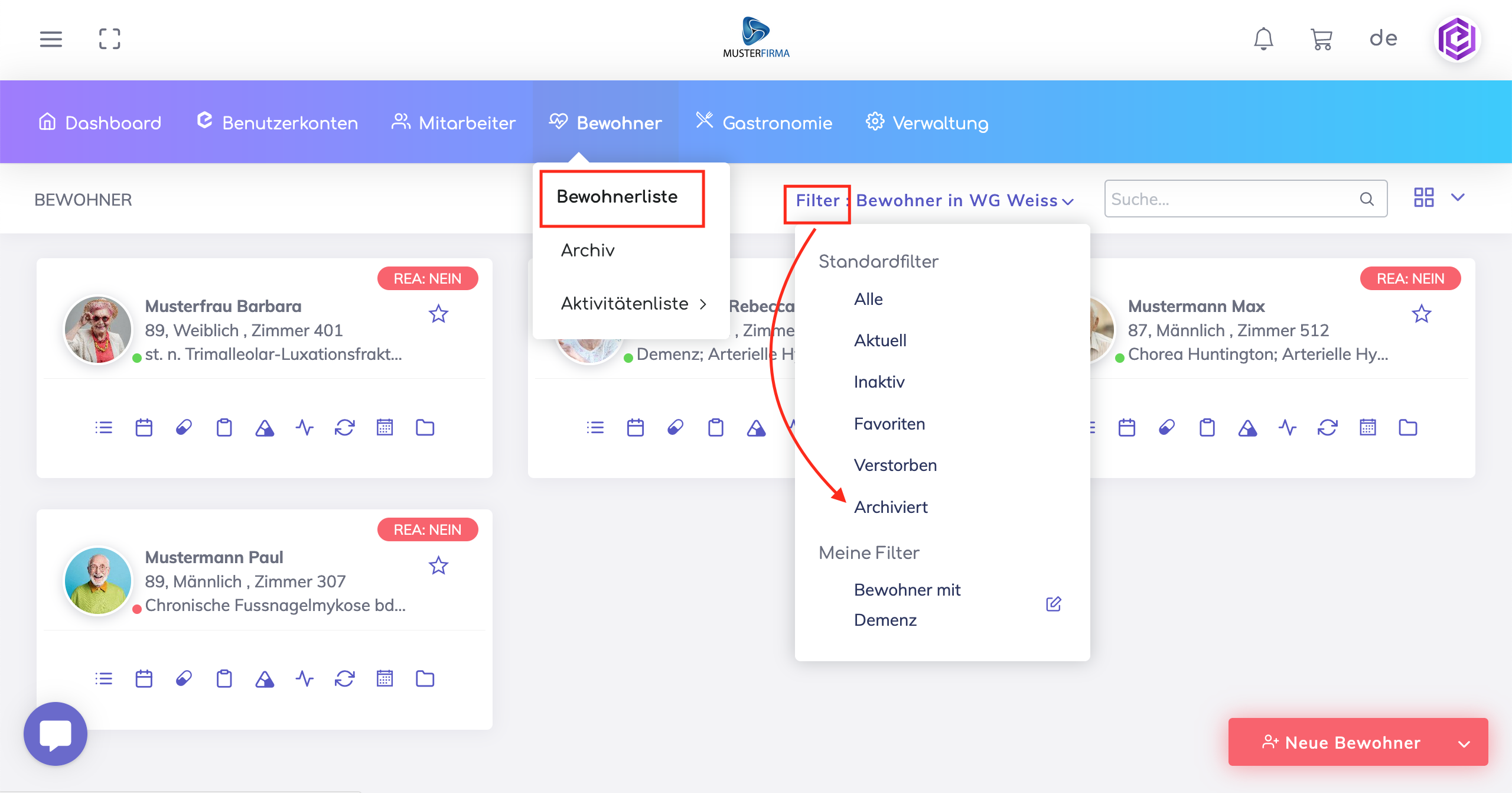 In der Bewohnerliste können Sie den Standardfilter verwenden, um die archivierten Bewohner anzuzeigen, wie unten gezeigt.