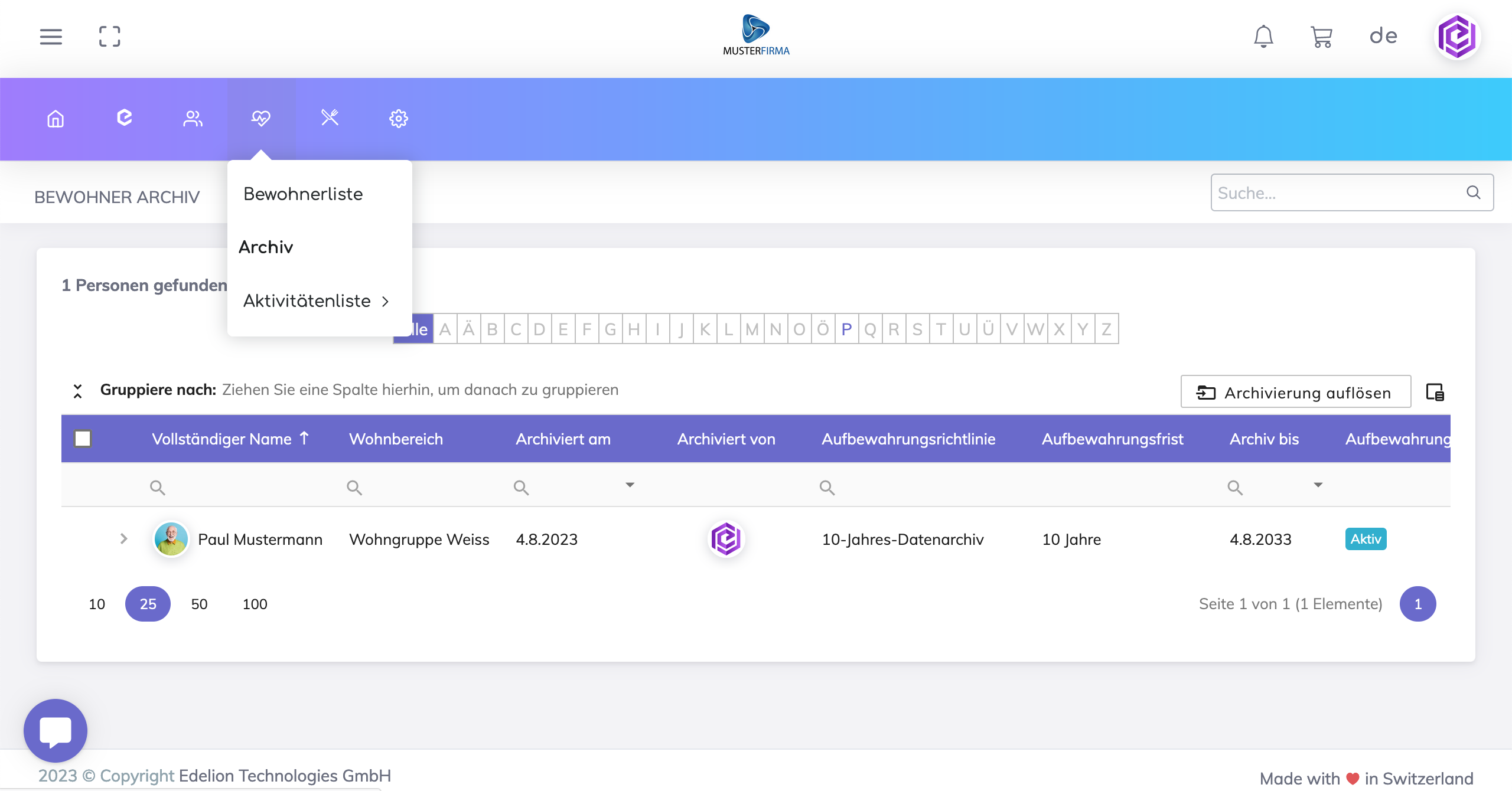 Die Archivliste unterscheidet sich von der Bewohnerliste (mit Filter), da sie archivierungsspezifische Informationen für jeden Datensatz anzeigt, d. h. Archiviert am Datum, Archiviert von, geltende Aufbewahrungsrichtlinie und Aufbewahrungsfrist, Archivierung bis Datum und Aufbewahrungsstatus.