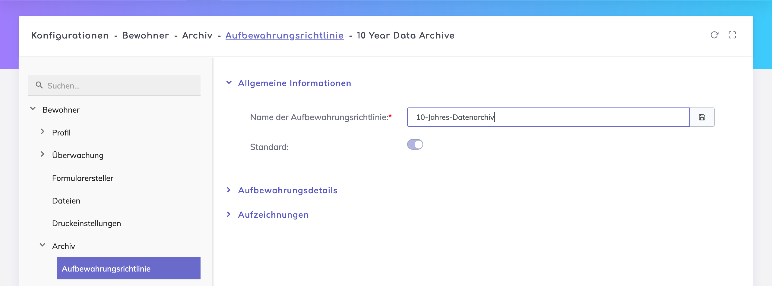 Konfigurationen > Bewohner > Archiv > Aufbewahrungsrichtlinie