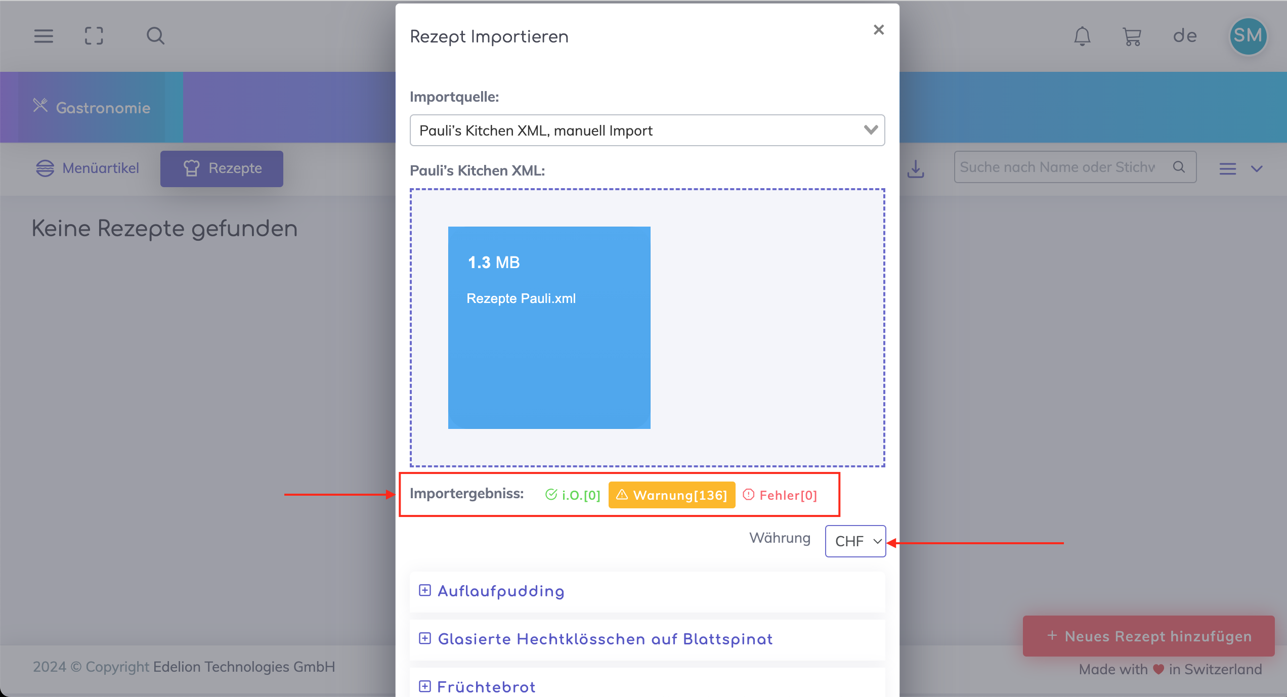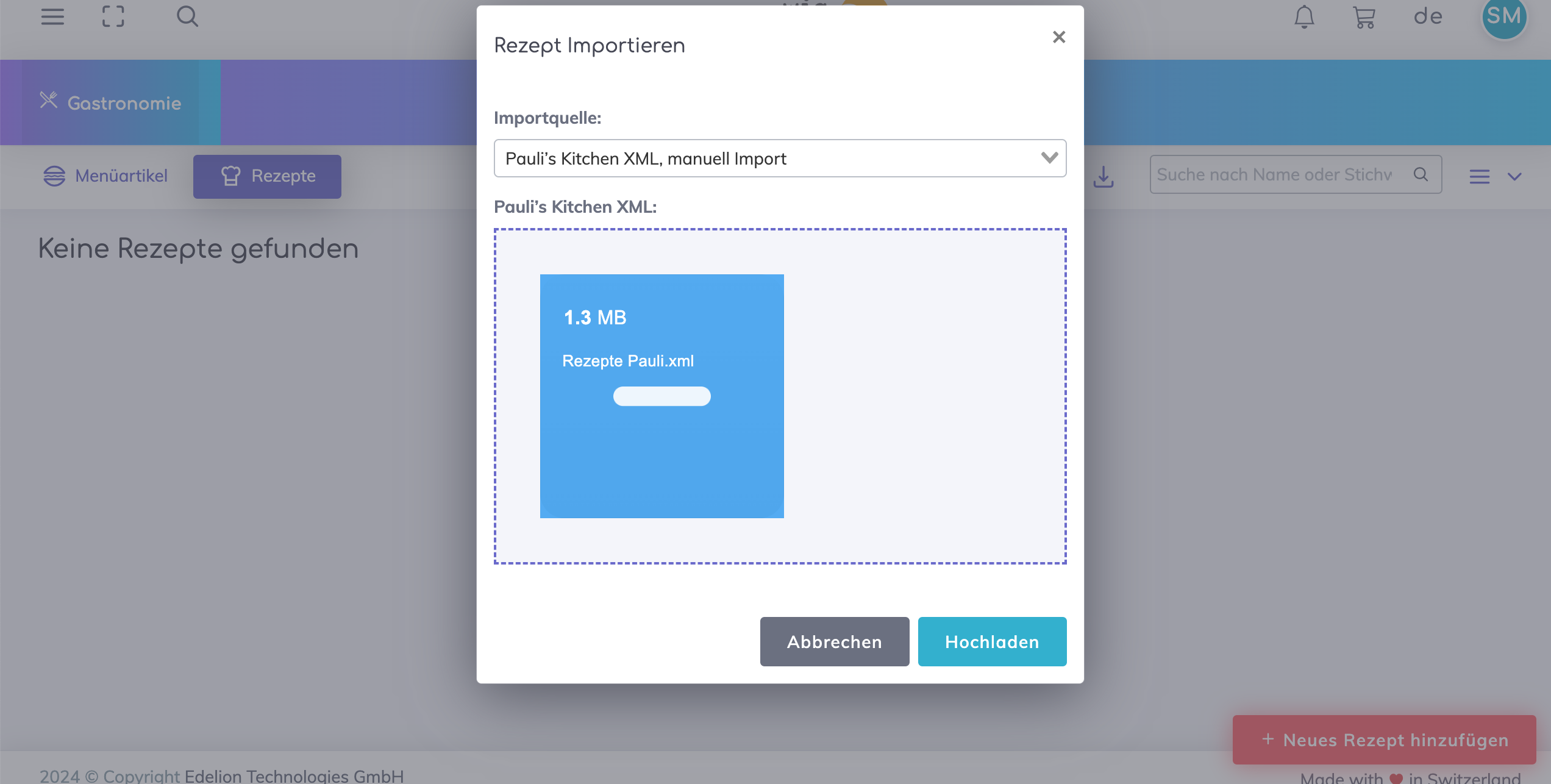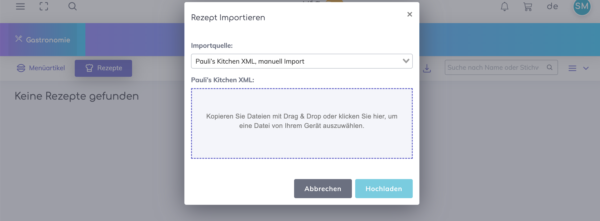 Wählen Sie im Popup „Pauli's Kitchen XML“ als Importquelle. Wählen Sie die XML-Datei mit den Rezepten aus, die Sie von Ihrem Gerät importieren möchten.
