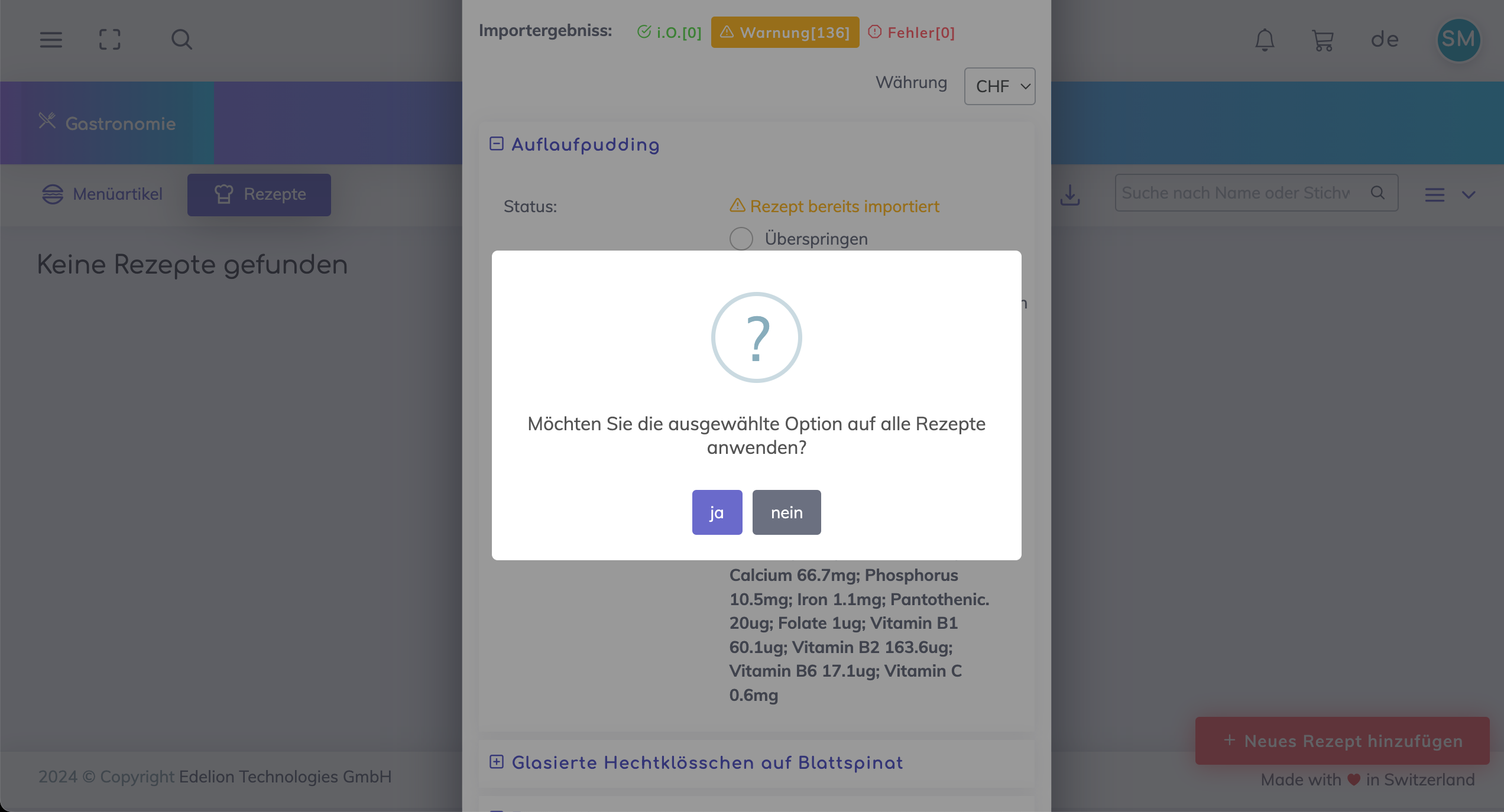 Wenn Sie eine Option auswählen, können Sie wählen, ob die gleiche Option für alle Rezepte gelten soll. Wenn Sie Nein auswählen, müssen Sie den Status jedes einzelnen Rezeptes einzeln festlegen.
