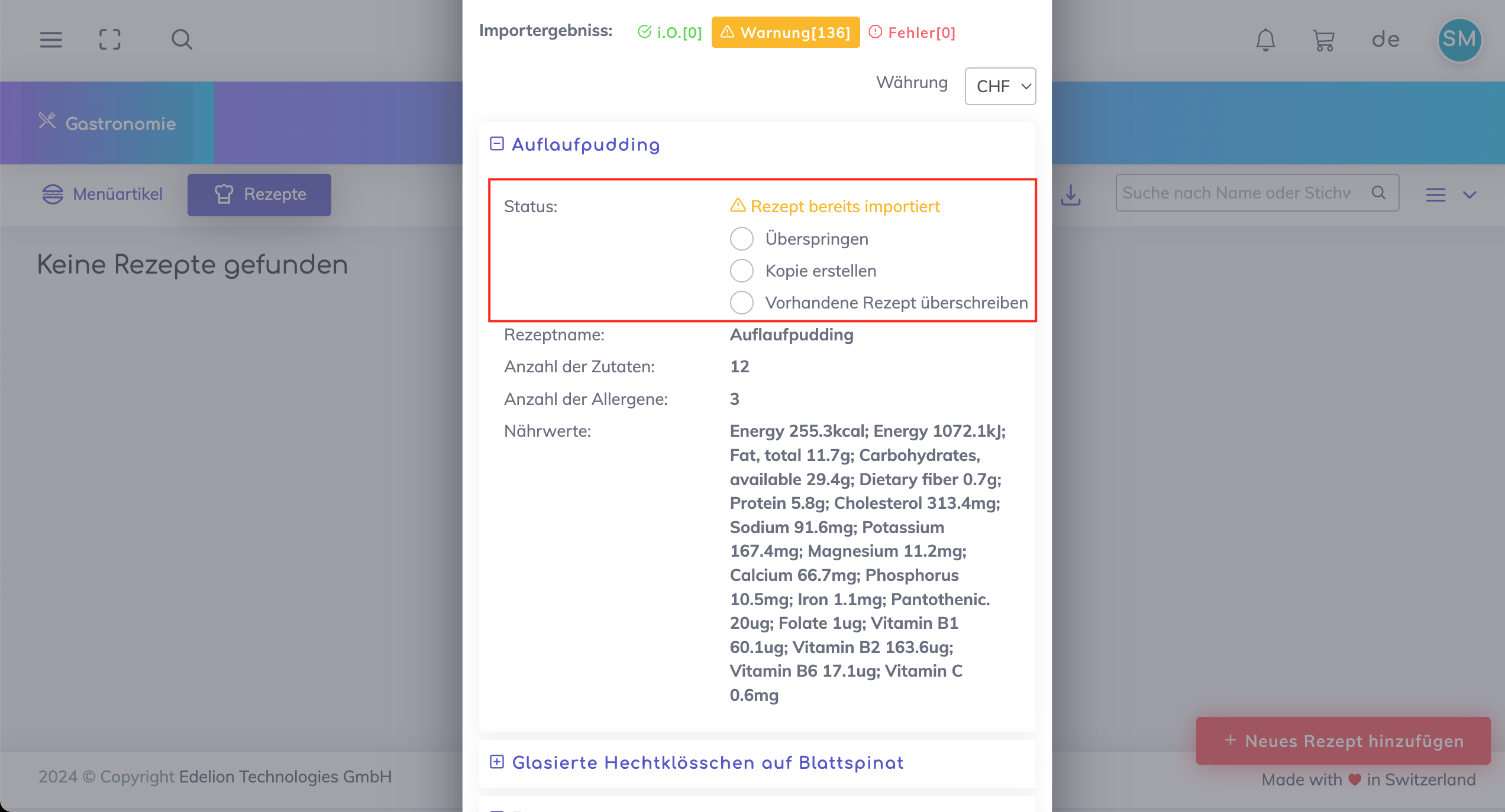 Wenn Sie auf eines der Rezepte klicken, wird der Status für dieses Rezept angezeigt. Sie haben die Möglichkeit, den Import dieses Rezepts zu überspringen, eine Kopie dieses Rezepts zu erstellen oder das vorhandene Rezept zu überschreiben.