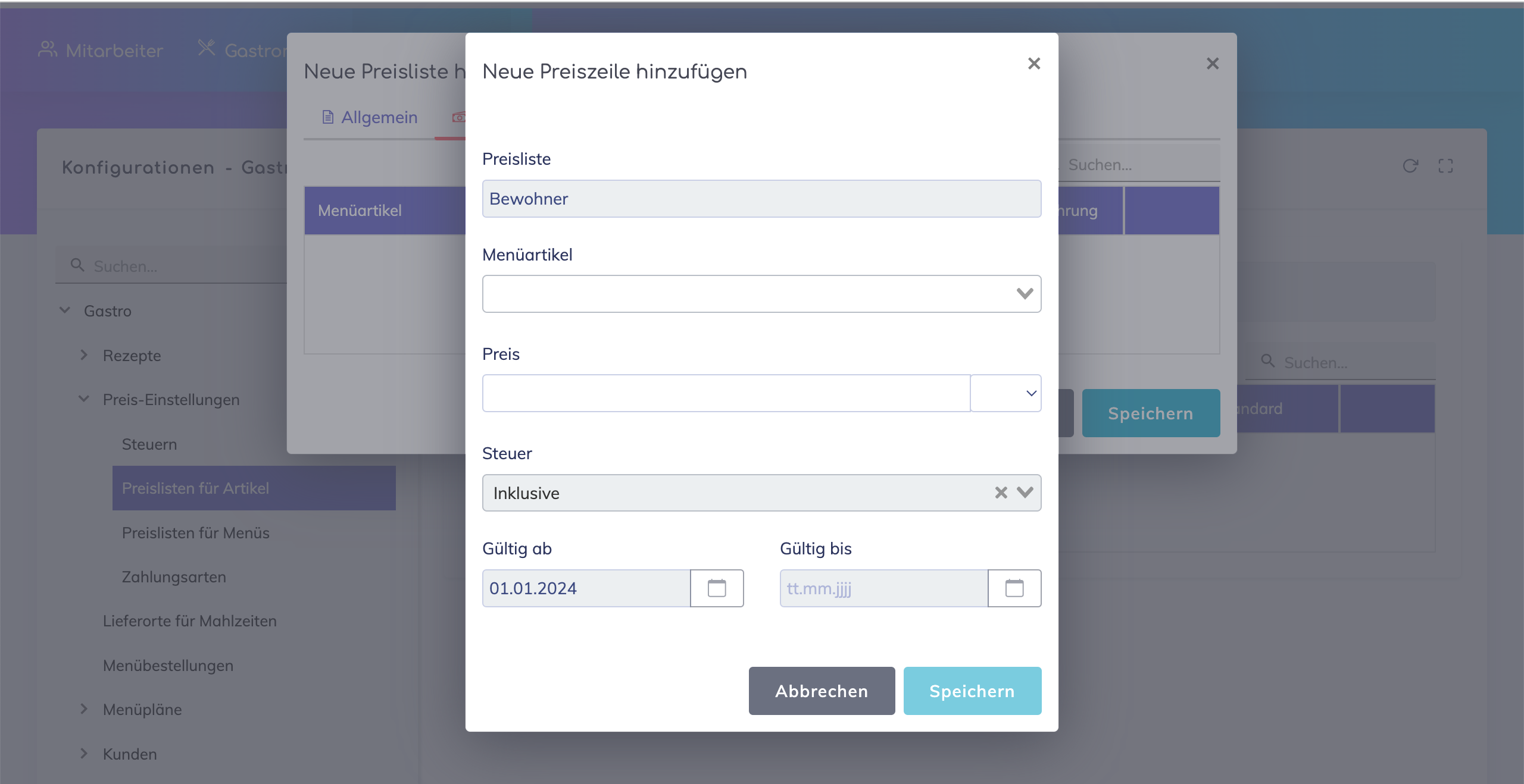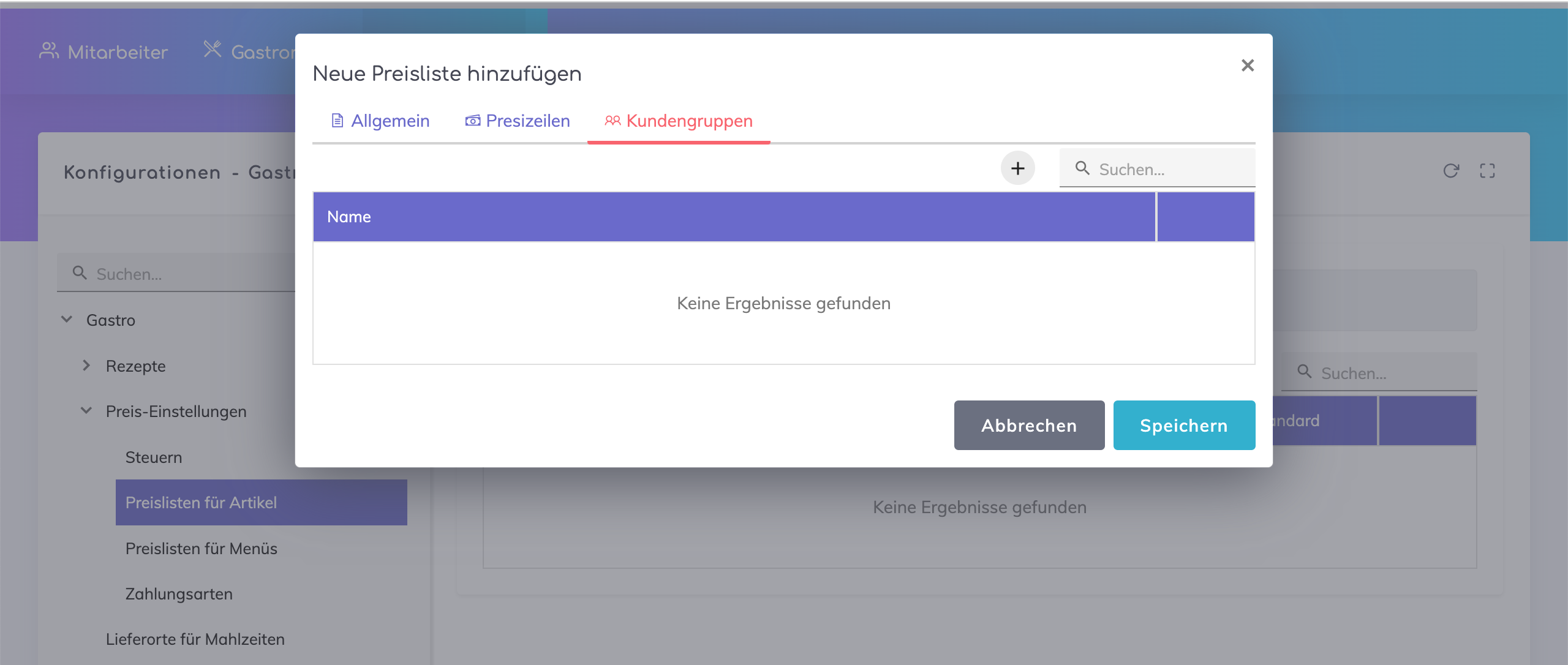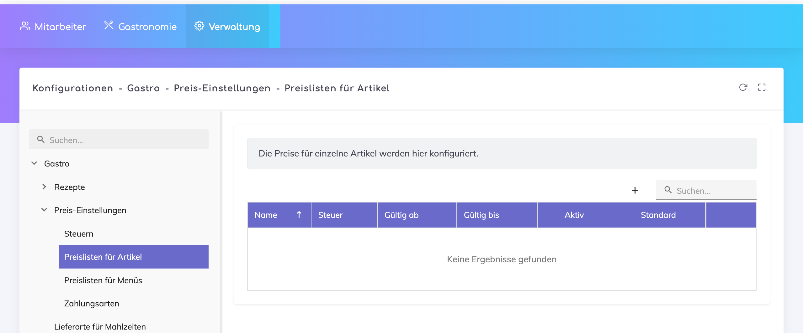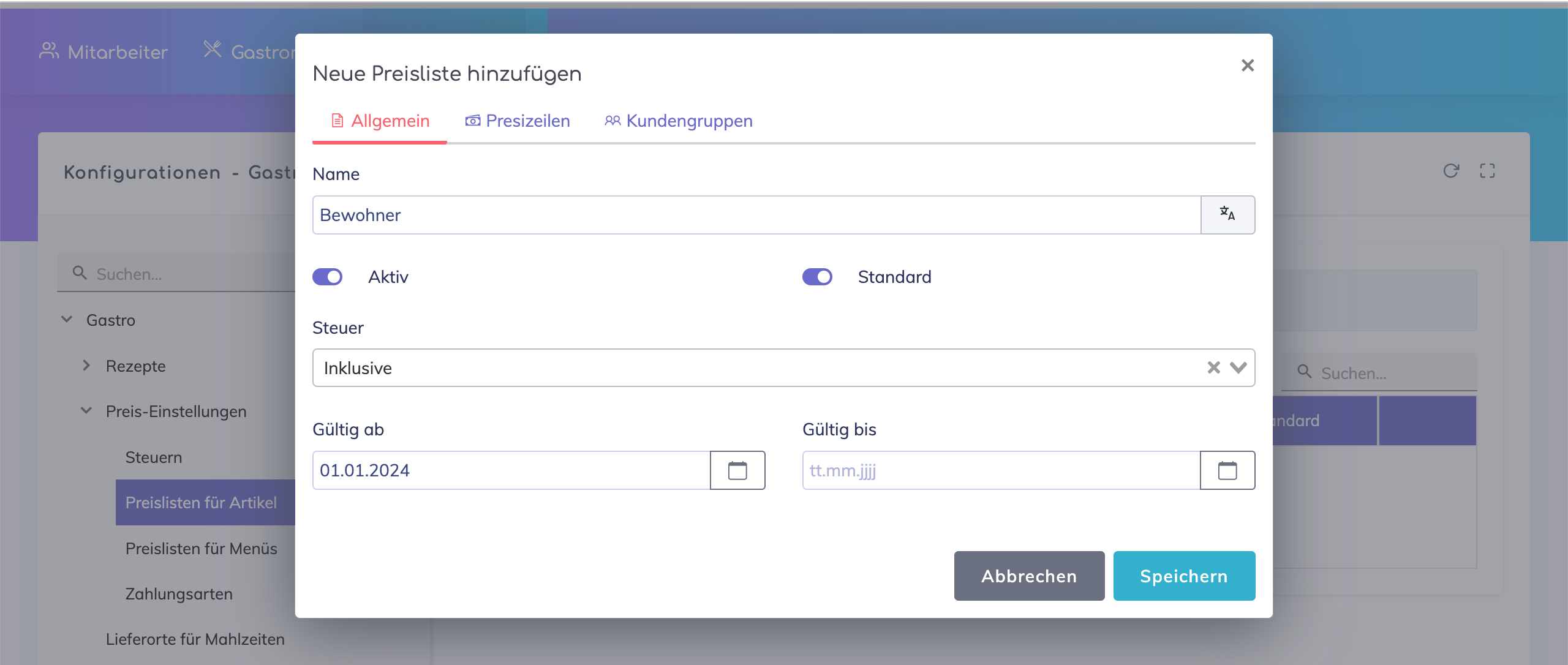 Konfigurationen > Gastro > Preiseinstellungen > Preislisten für Artikel