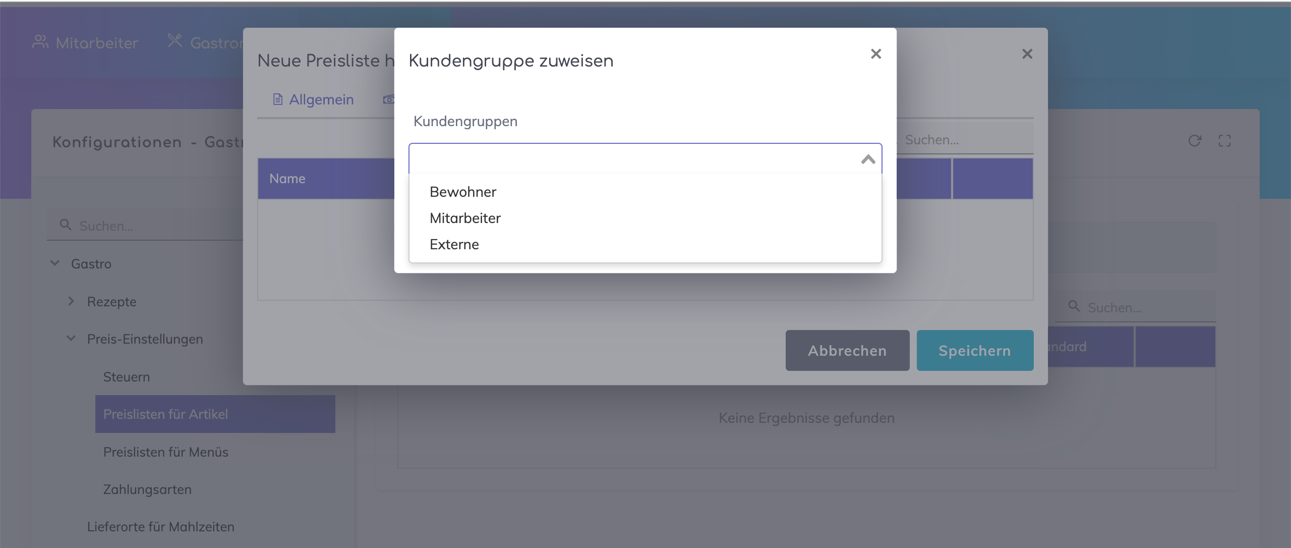 Alle Menüartikel haben festgelegte Preise. Ein Menüartikel kann für verschiedene Kundengruppen unterschiedliche Preise haben. Zum Beispiel kann ein Artikel für einen Bewohner kostenlos sein, da er im monatlichen Pensionspreis enthalten ist, aber für einen externen Gast wäre dieser Artikel kostenpflichtig. Daher sind für verschiedene Kundengruppen unterschiedliche Preislisten erforderlich.