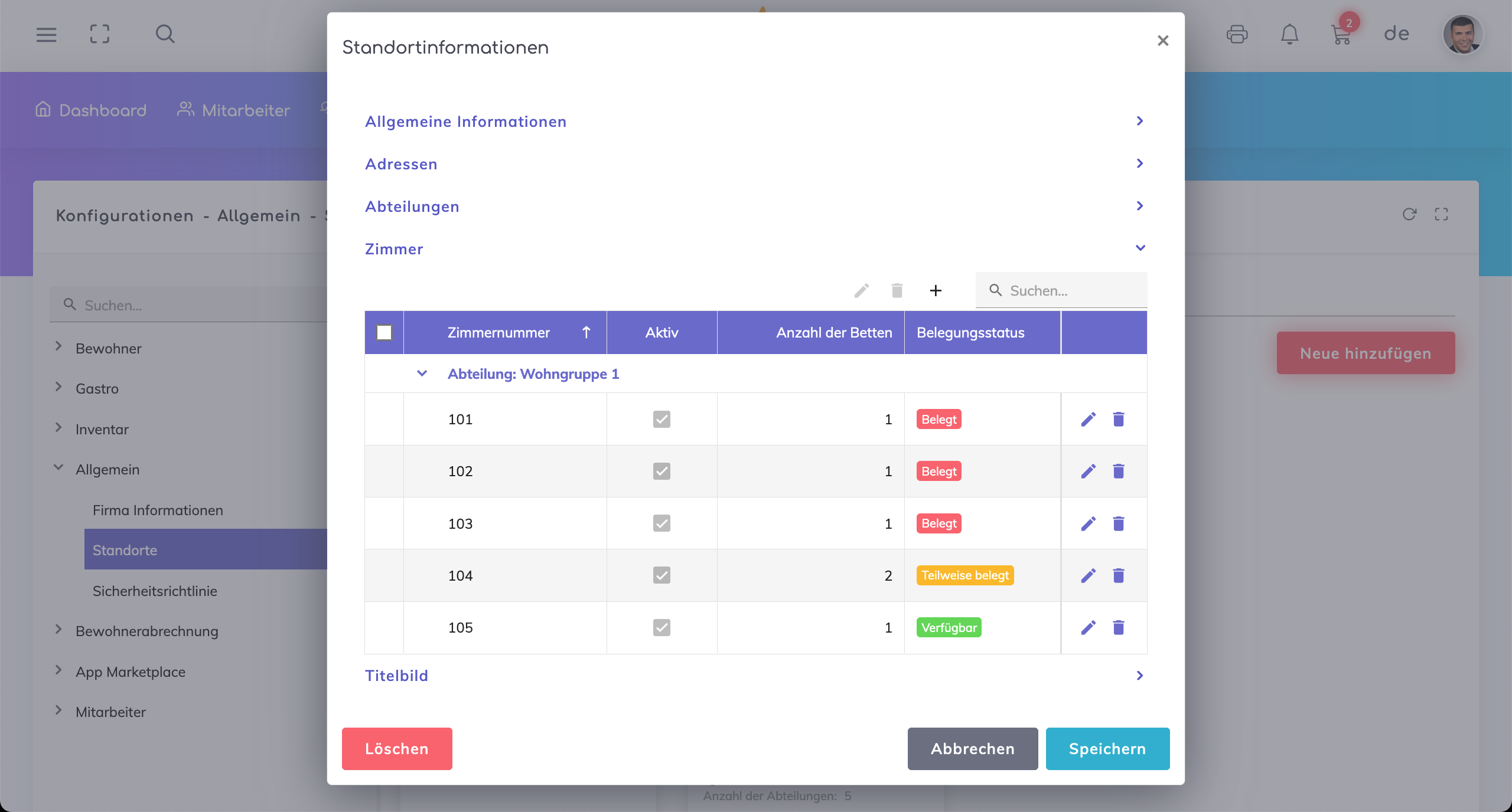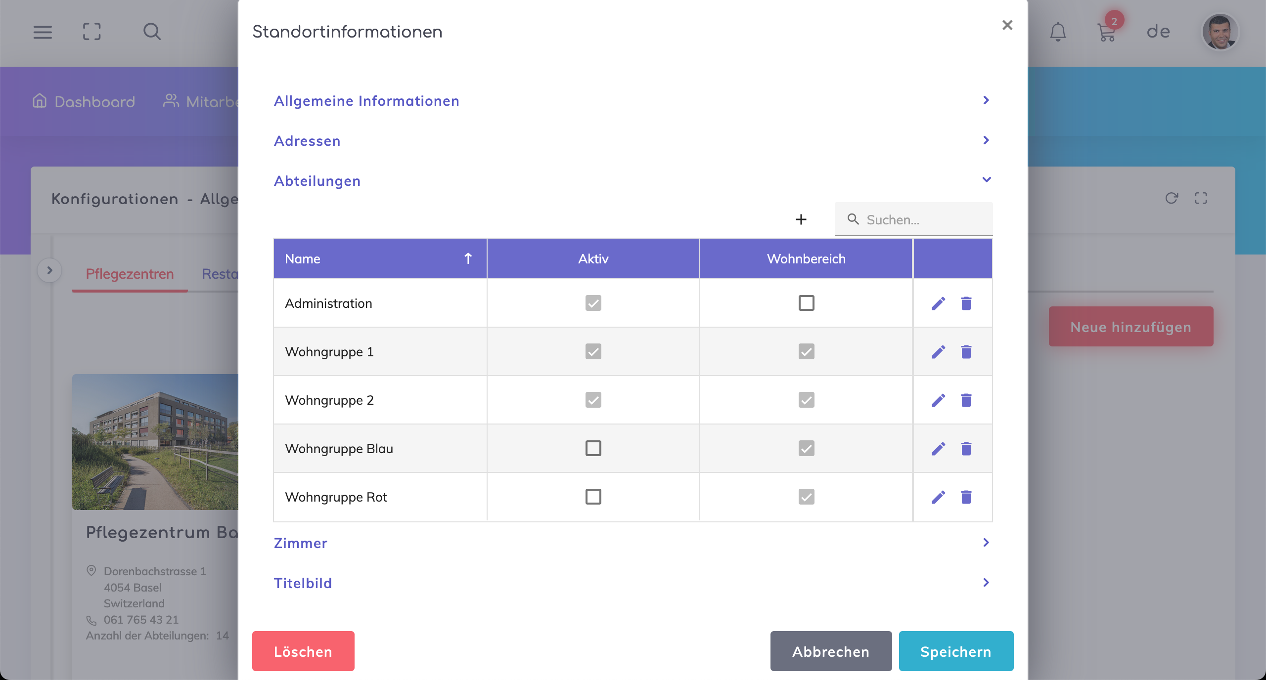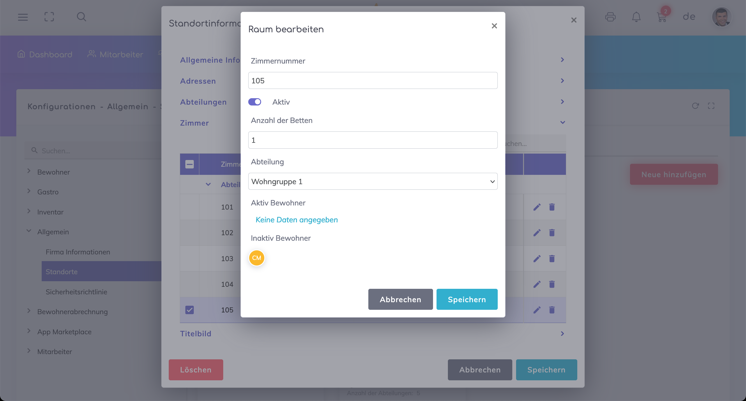 Aktiv Feld - Wenn aktiviert, ist die Abteilung im Feld Wohnbereich in den Profilen von Bewohnern und Mitarbeitern verfügbar.
