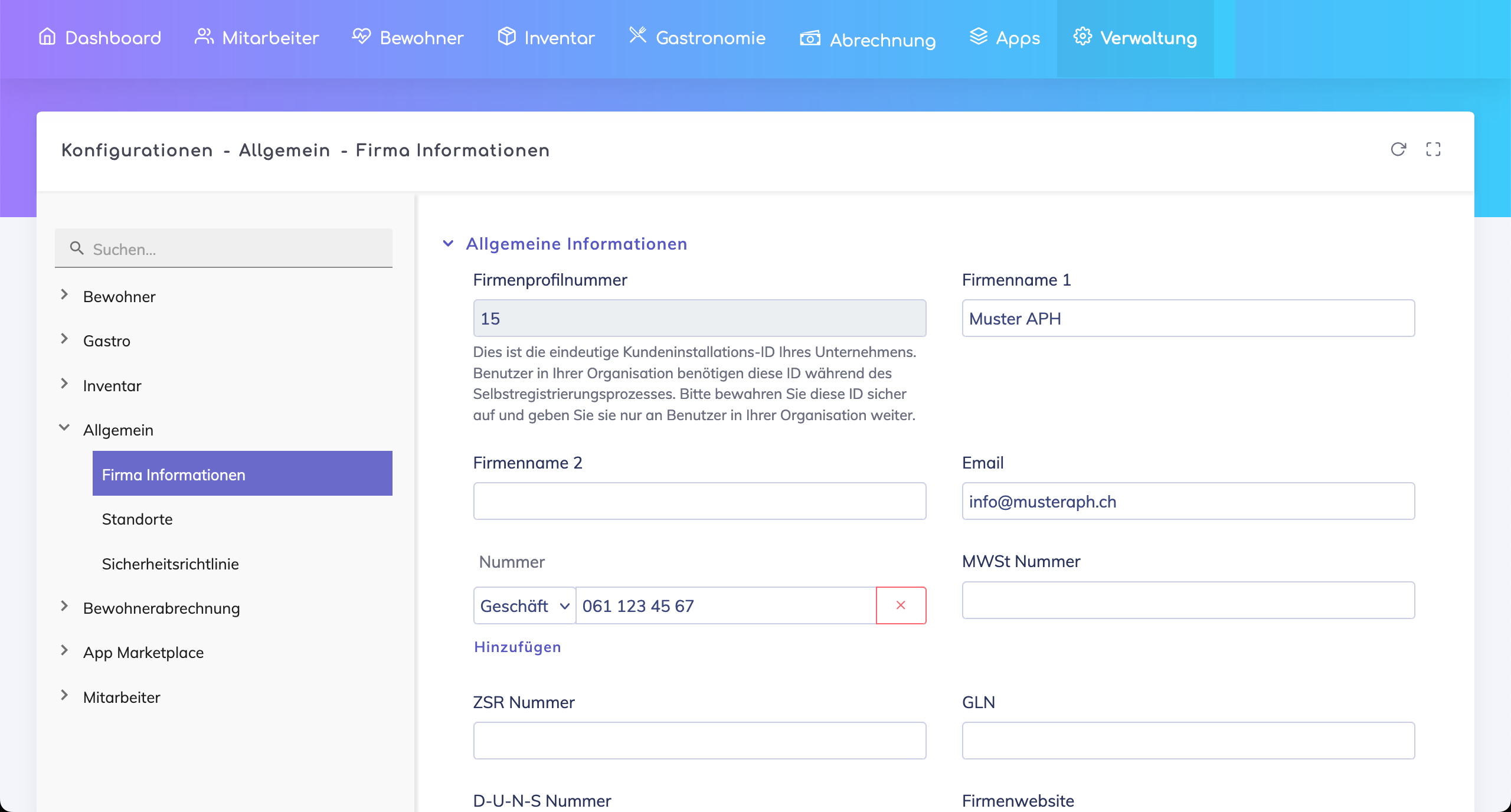 Dies kann wie folgt eingerichtet werden: Gehen Sie zu Verwaltung > Konfigurationen > Allgemein > Firma Informationen