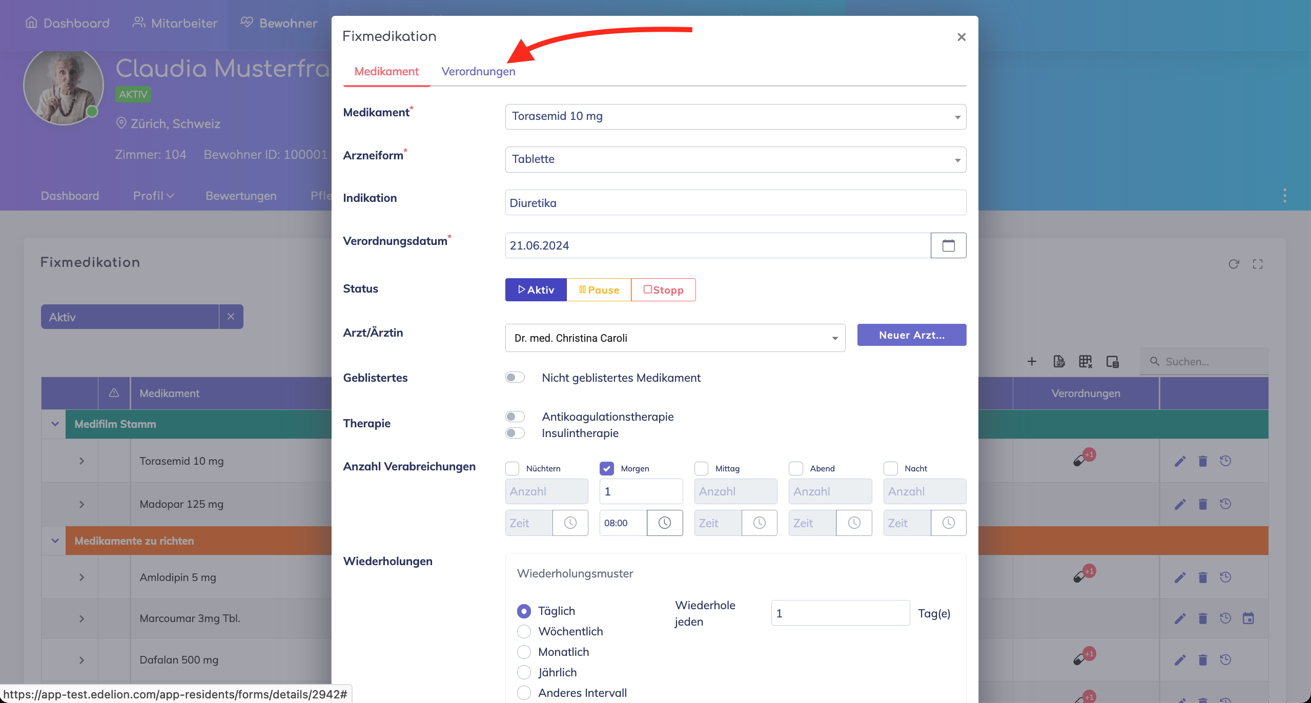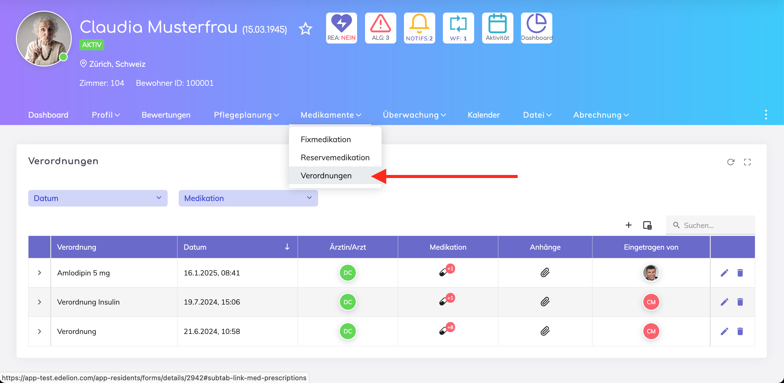 Gehen Sie zu Bewohner > Medikamente > Verordnungen.