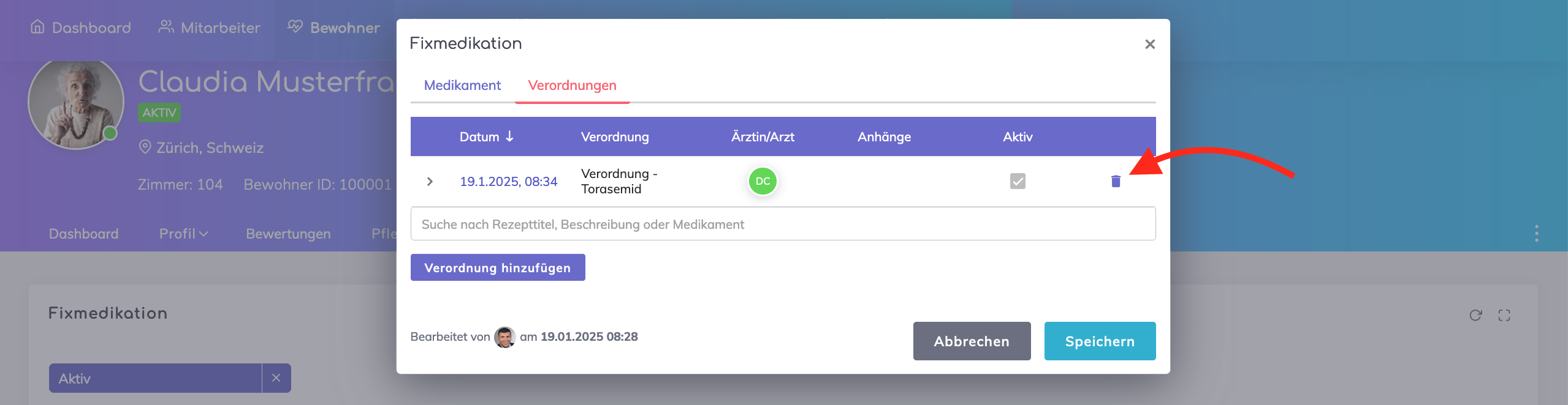 Hinweis: Wenn Sie auf das Löschsymbol bei einer Verordnung klicken, wird die Verknüpfung der Verordnung mit dem Medikament entfernt. Die Verordnung wird nicht gelöscht und kann im Bereich Verordnungen (Bewohner > Medikamente > Verordnungen) gefunden werden.