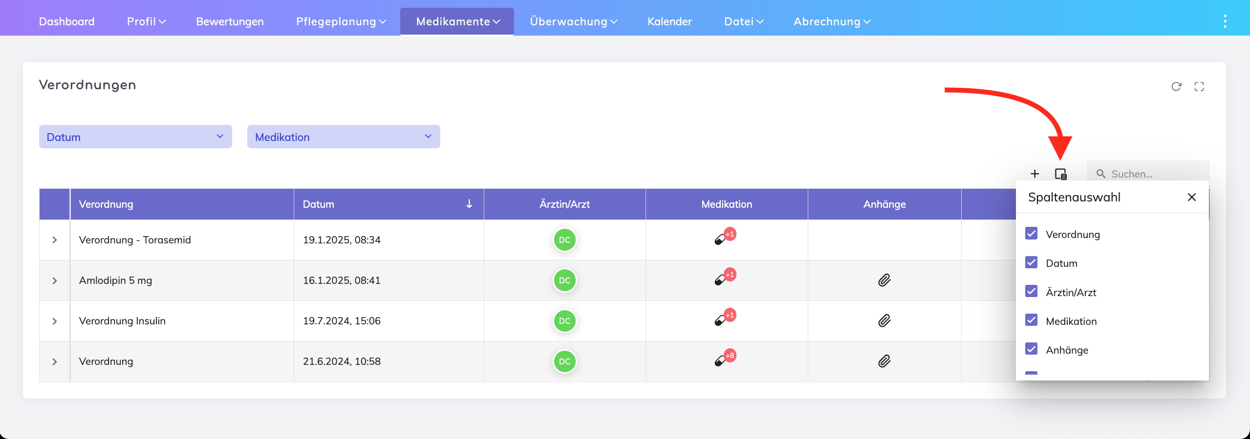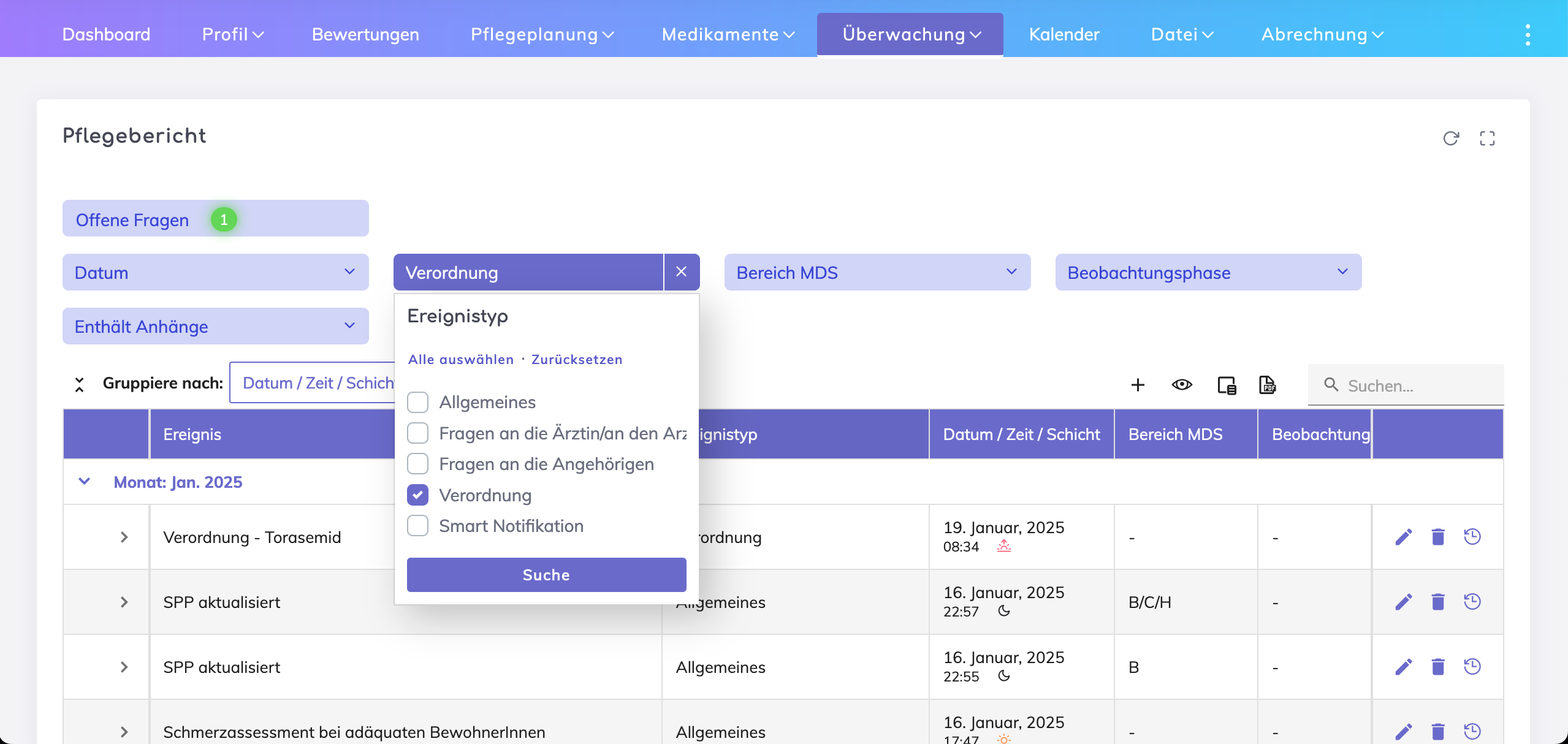 In der Übersichtstabelle können Sie die Pflegebericht-Einträge für Verordnungen wie gezeigt filtern.