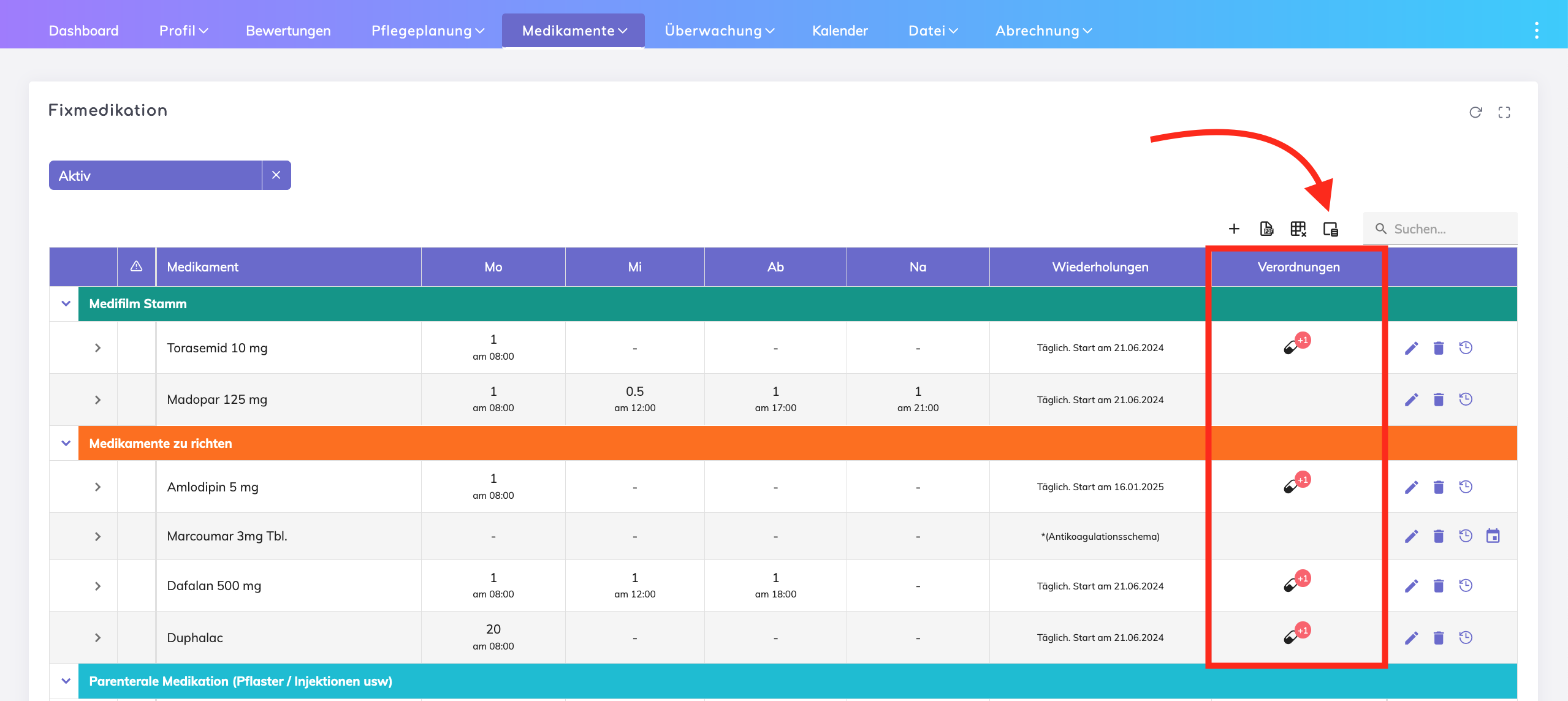 Gehen Sie zu Bewohner > Medikamente > Fix Medikation oder Reservemedikation.