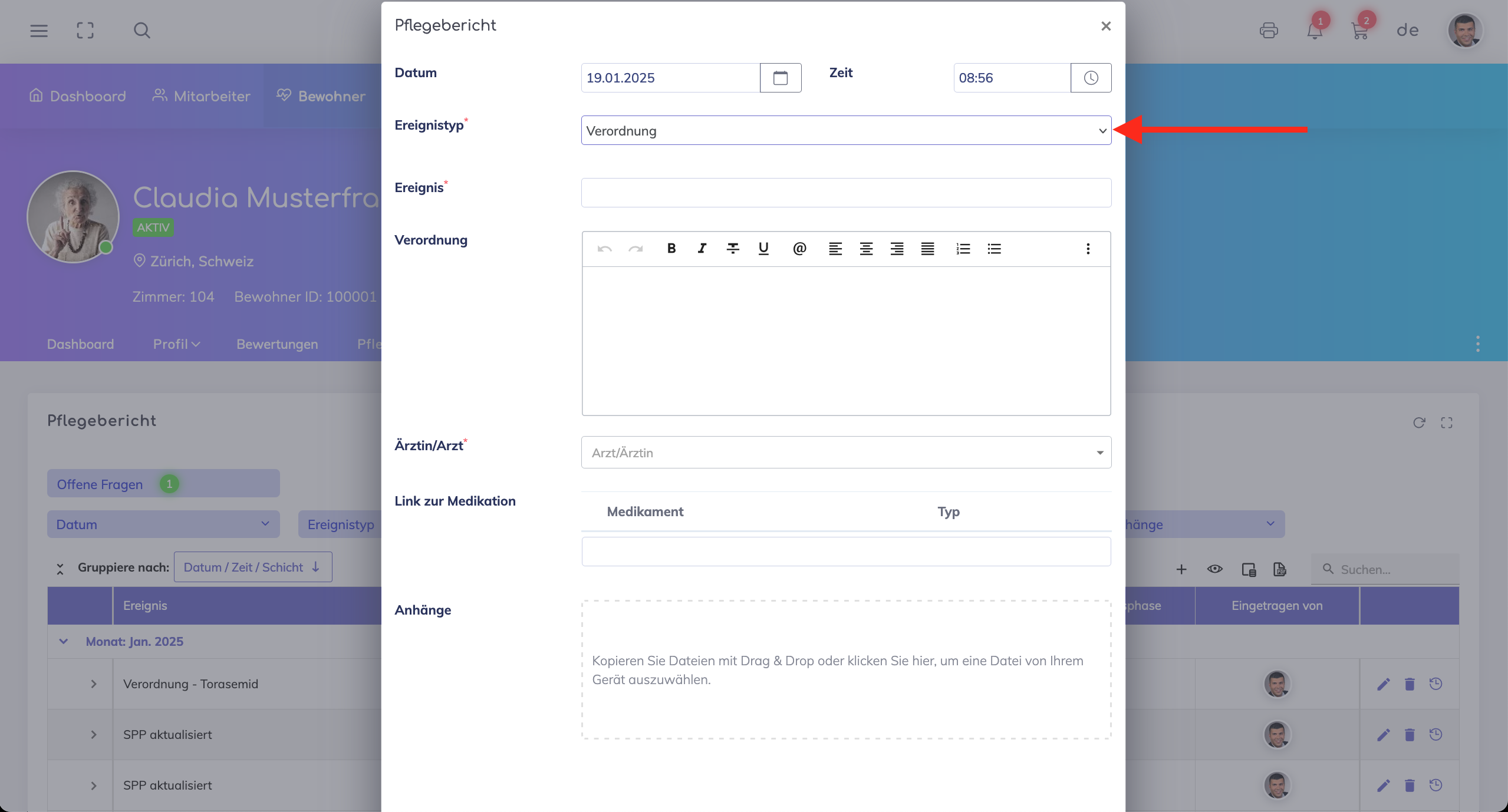 Wählen Sie im Pflegebericht-Pop-up-Bildschirm den Ereignistyp "Verordnung" aus.