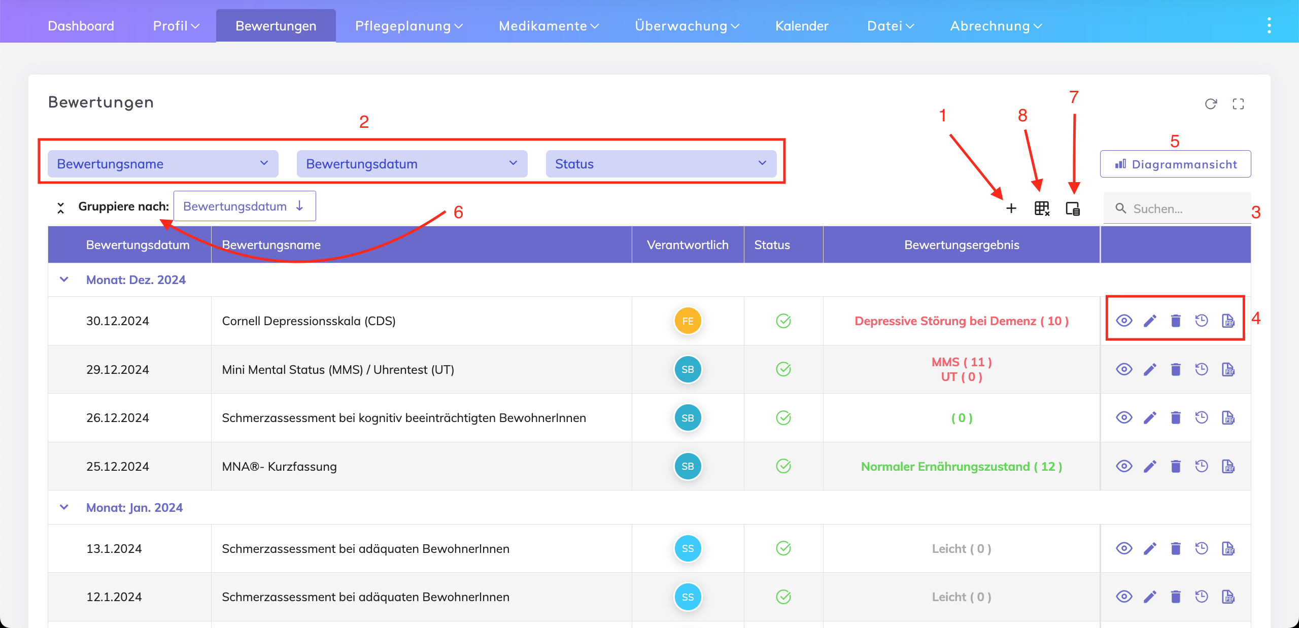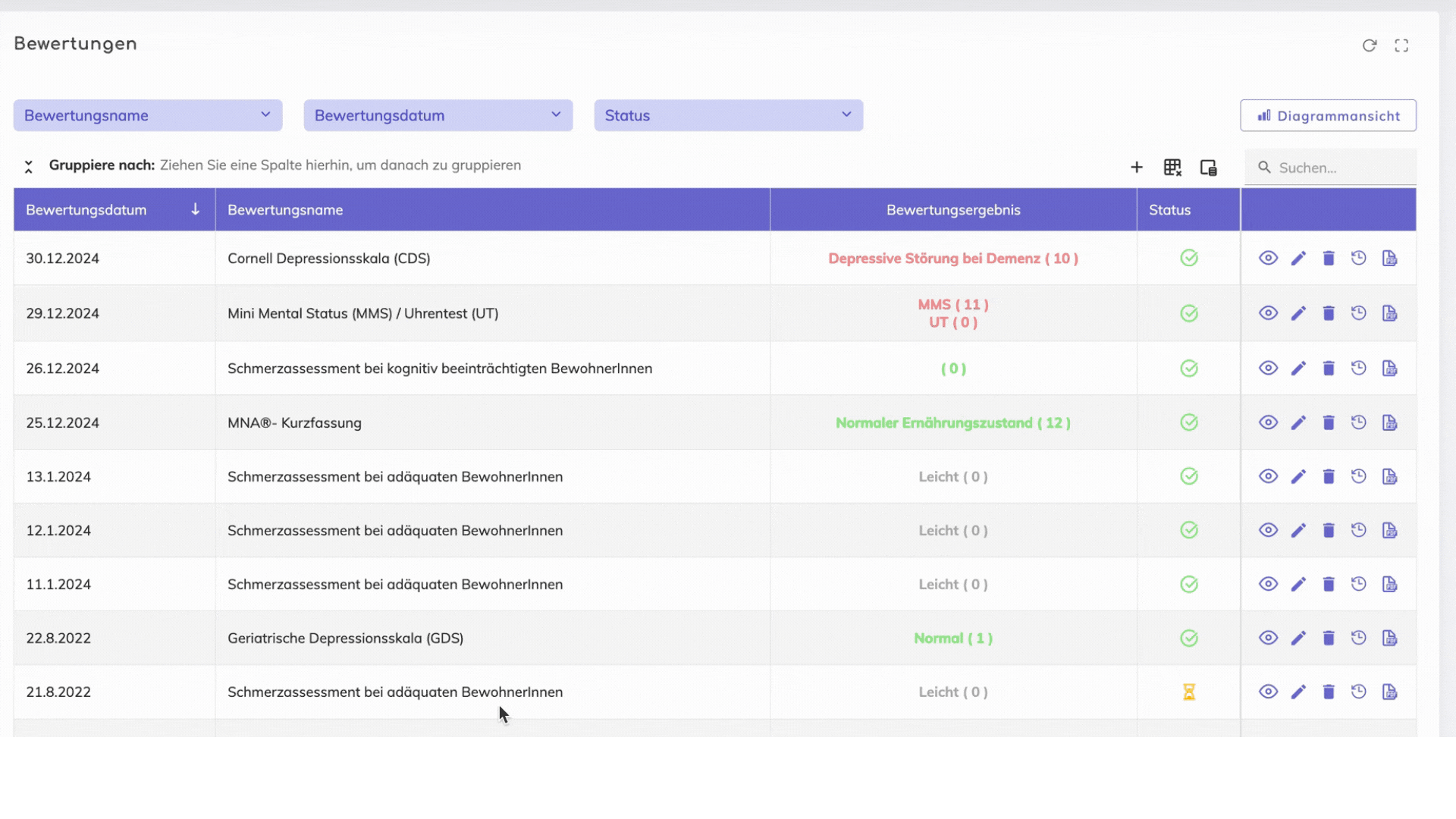 Die Übersicht zeigt alle durchgeführten Assessments für eine Bewohnerin oder einen Bewohner. Die Standardansicht ist eine Tabellen-/Listenansicht, wie unten gezeigt, und es ist auch möglich, alle Assessments in einer Diagrammansicht anzuzeigen.
