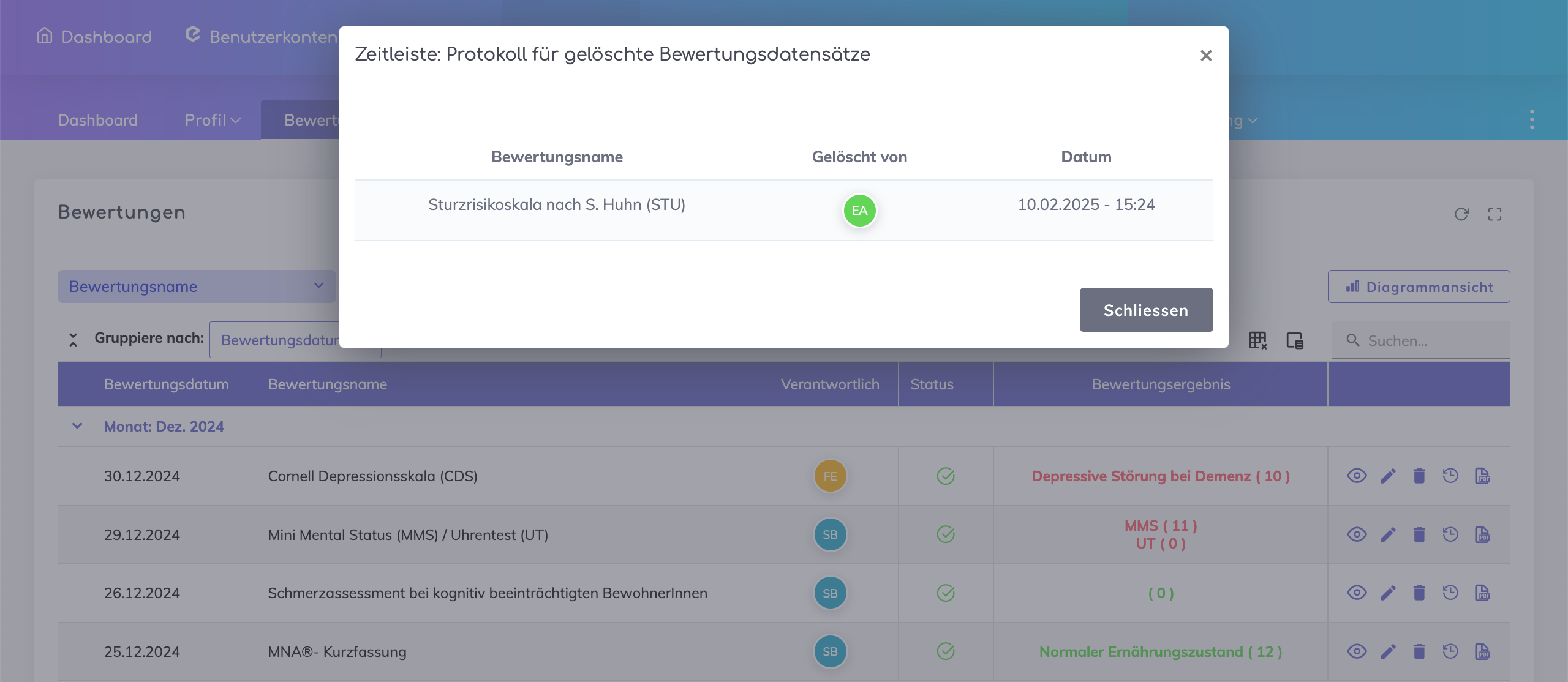 Löschprotokoll - Zeigt die Assessments an, die von einem Benutzer gelöscht wurden, einschliesslich Löschdatum und Uhrzeit.