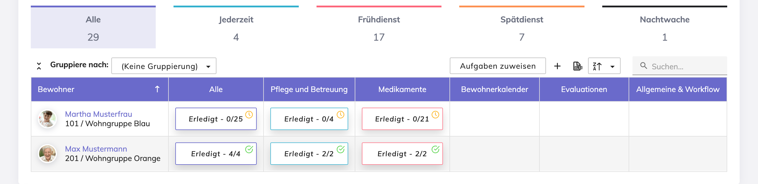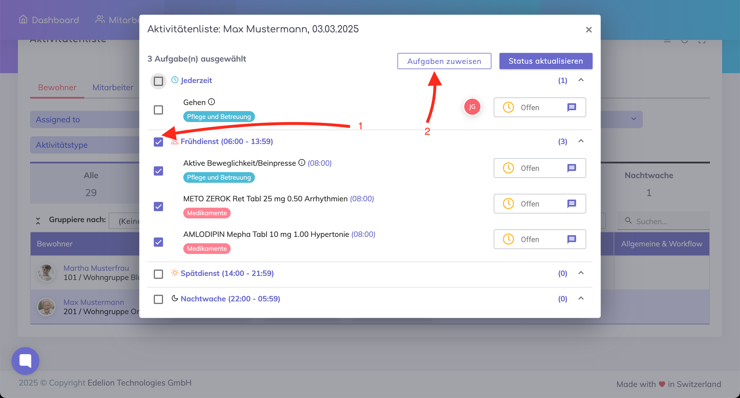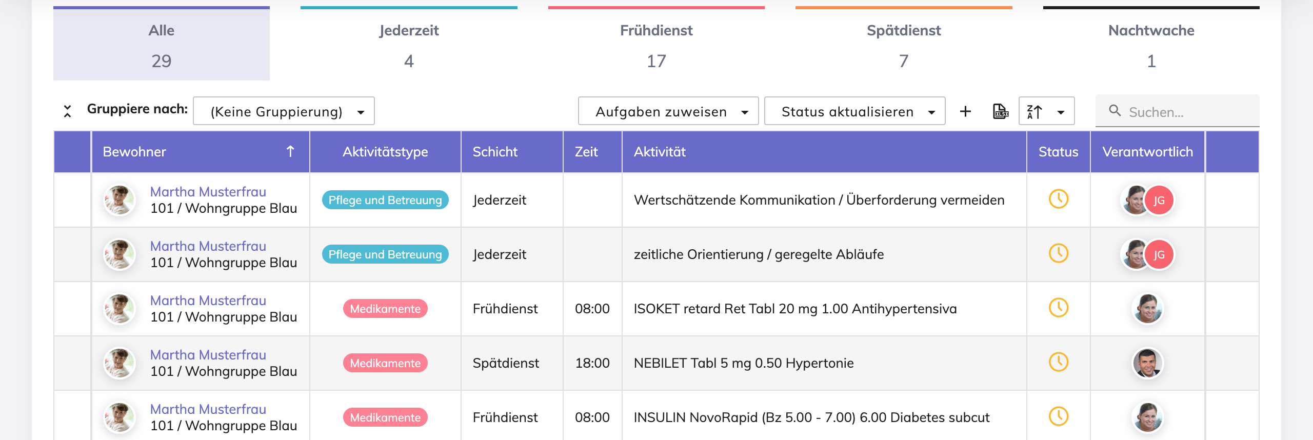 Es ist möglich, einzelne oder mehrere Aufgaben für einen Bewohner einem oder mehreren Pflegekräften zuzuweisen, wie gezeigt.
