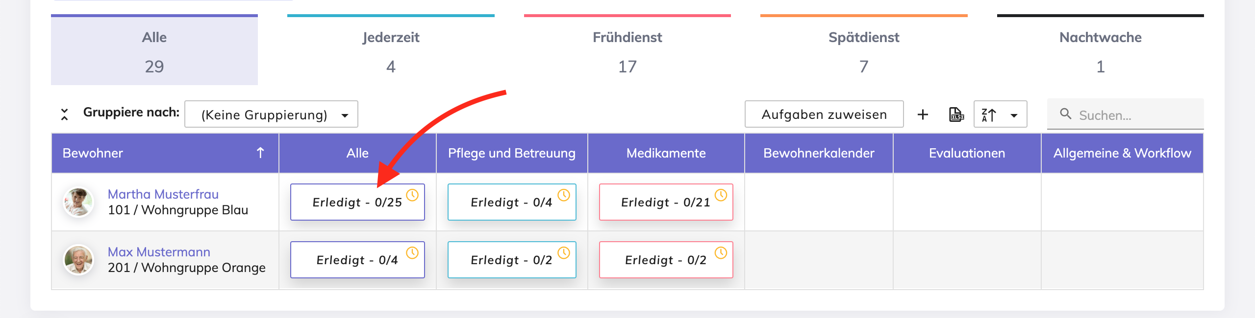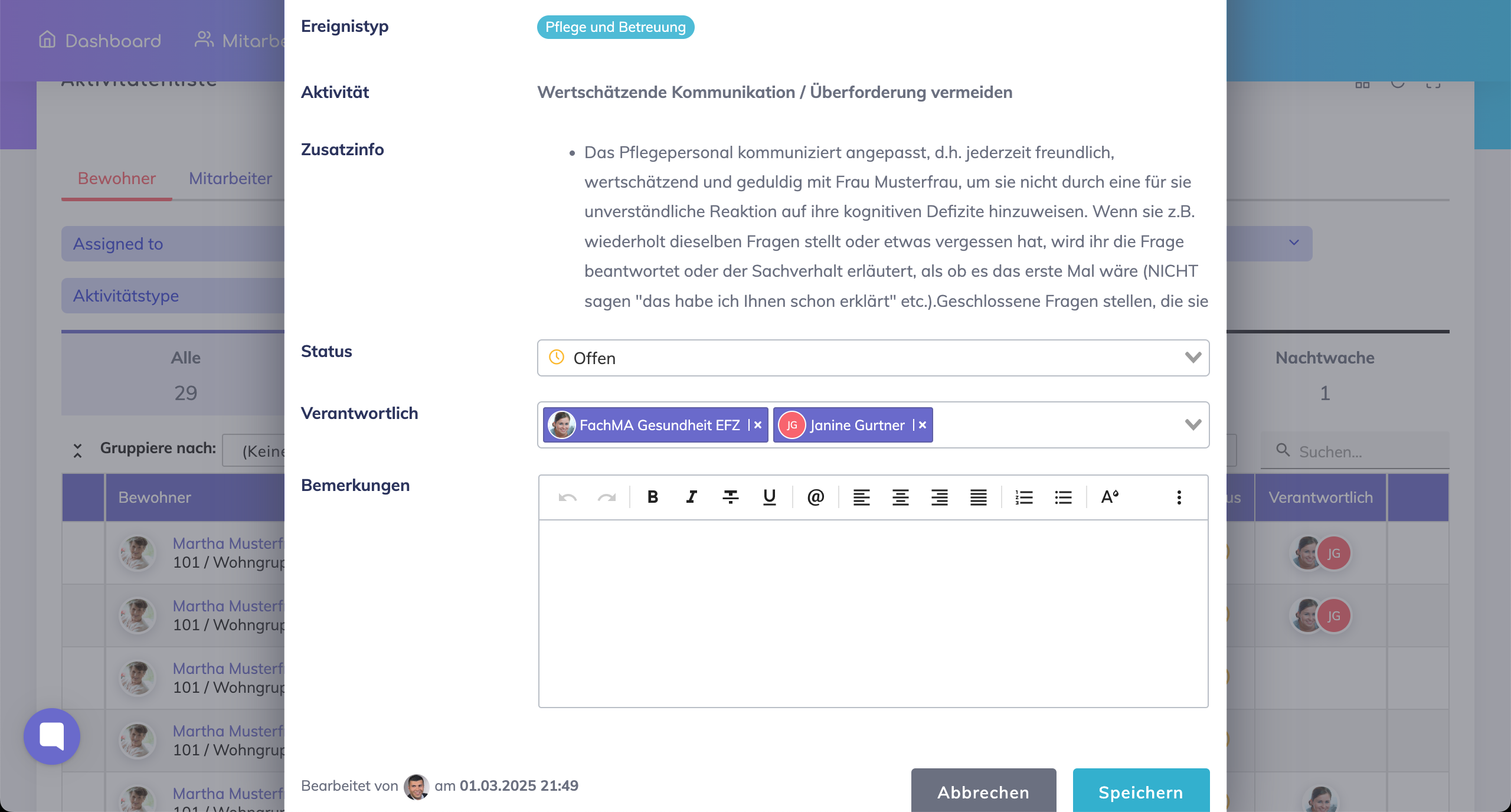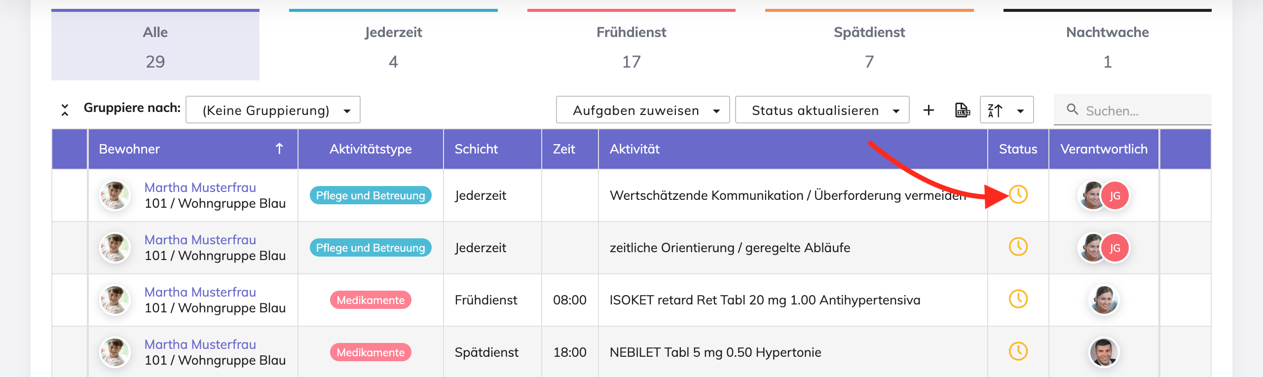 Es ist möglich, einzelne oder mehrere Aufgaben für einen Bewohner einem oder mehreren Pflegekräften zuzuweisen, wie gezeigt.