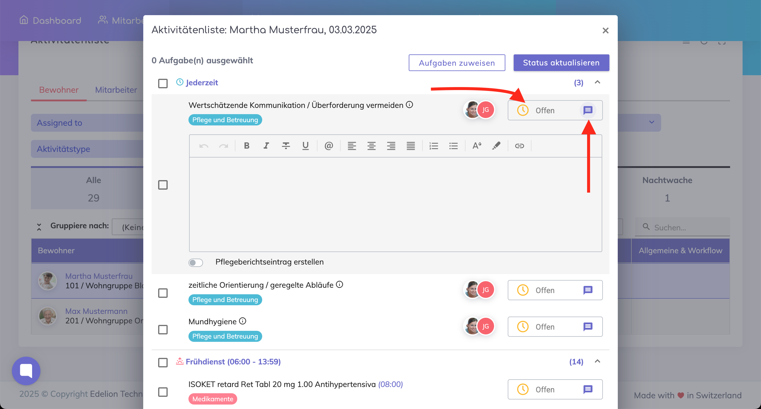 Listenansicht: Klicken Sie auf das Statussymbol, um die Aufgabe in einem Pop-up zu öffnen. Danach können Sie den Status aktualisieren und speichern.
