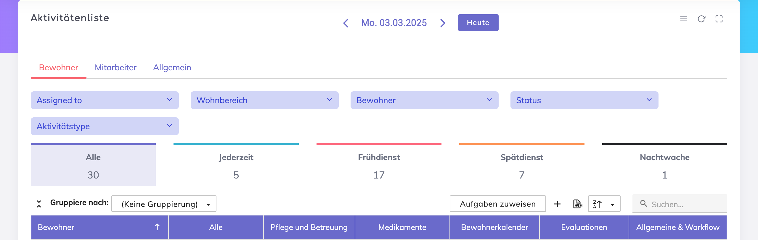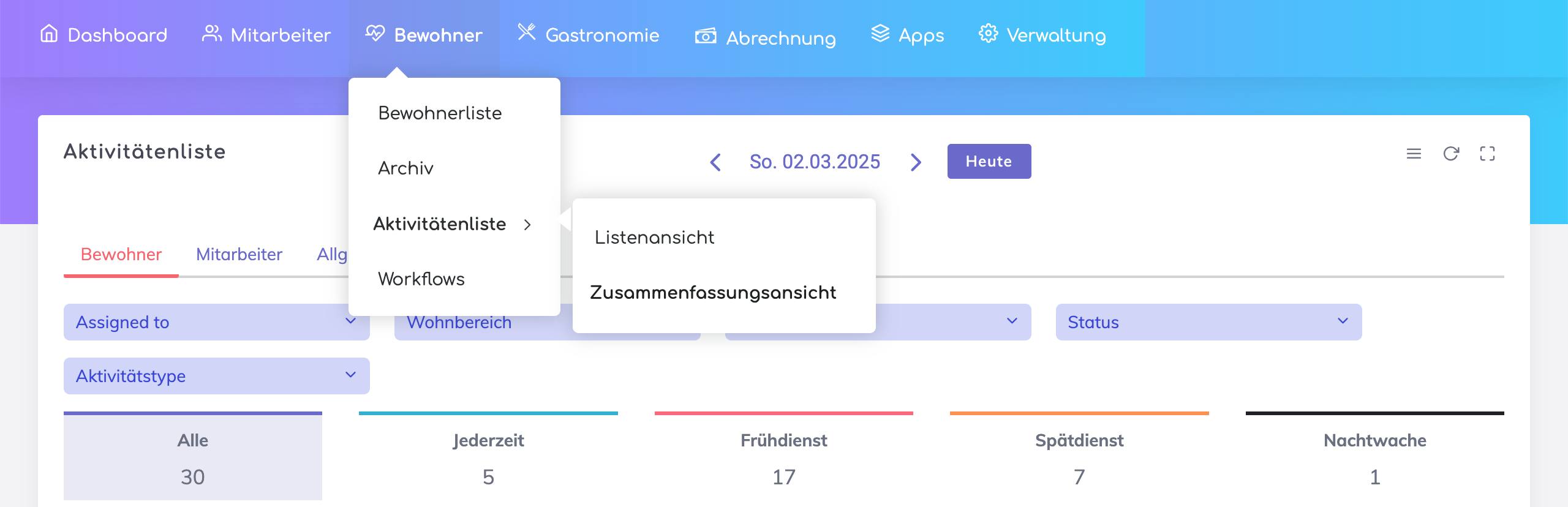 Öffnen Sie die Aktivitätenliste aus dem Menü der Bewohner-App: Bewohner > Aktivitätenliste > Listen-/Übersichtsansicht.