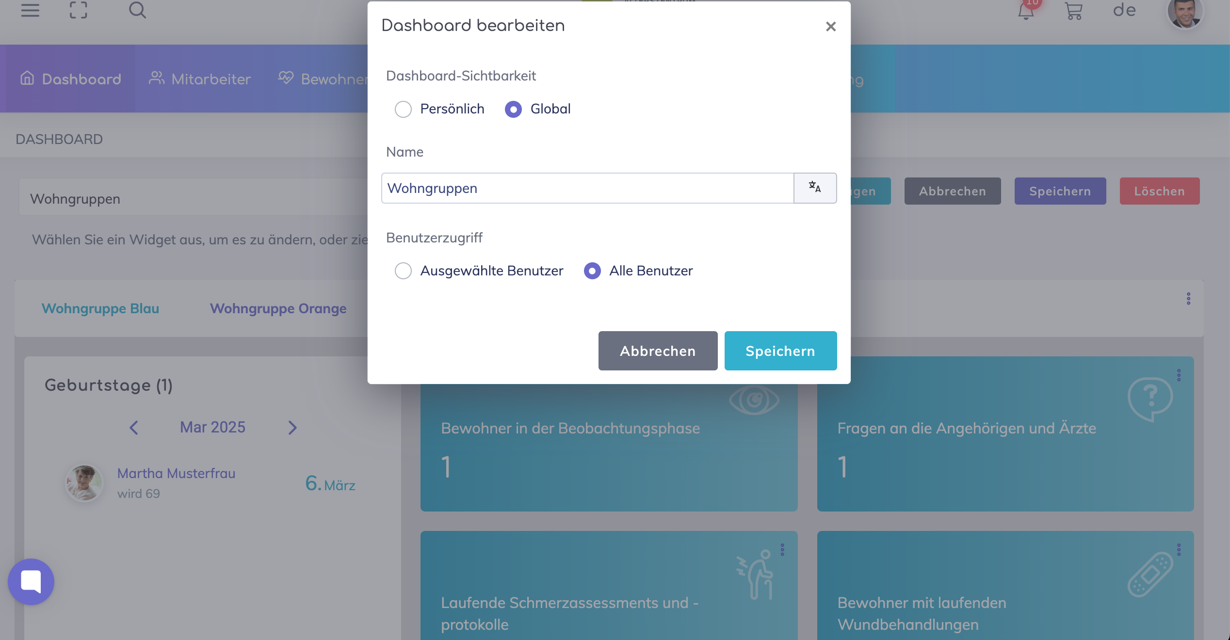 Geben Sie einen Dashboard-Namen ein und wählen Sie aus, ob das Dashboard ein persönliches oder globales Dashboard sein soll. Ein persönliches Dashboard ist nur für Sie sichtbar, aber ein globales Dashboard kann mit ausgewählten oder allen Benutzern geteilt werden.
