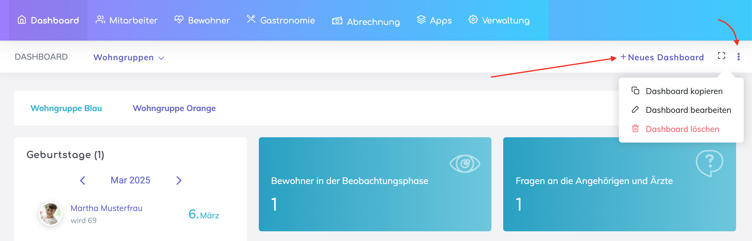 Tippen Sie auf "+Neues Dashboard", wenn Sie ein bestehendes Dashboard bearbeiten, tippen Sie auf das Optionssymbol und klicken Sie auf „Dashboard bearbeiten“.