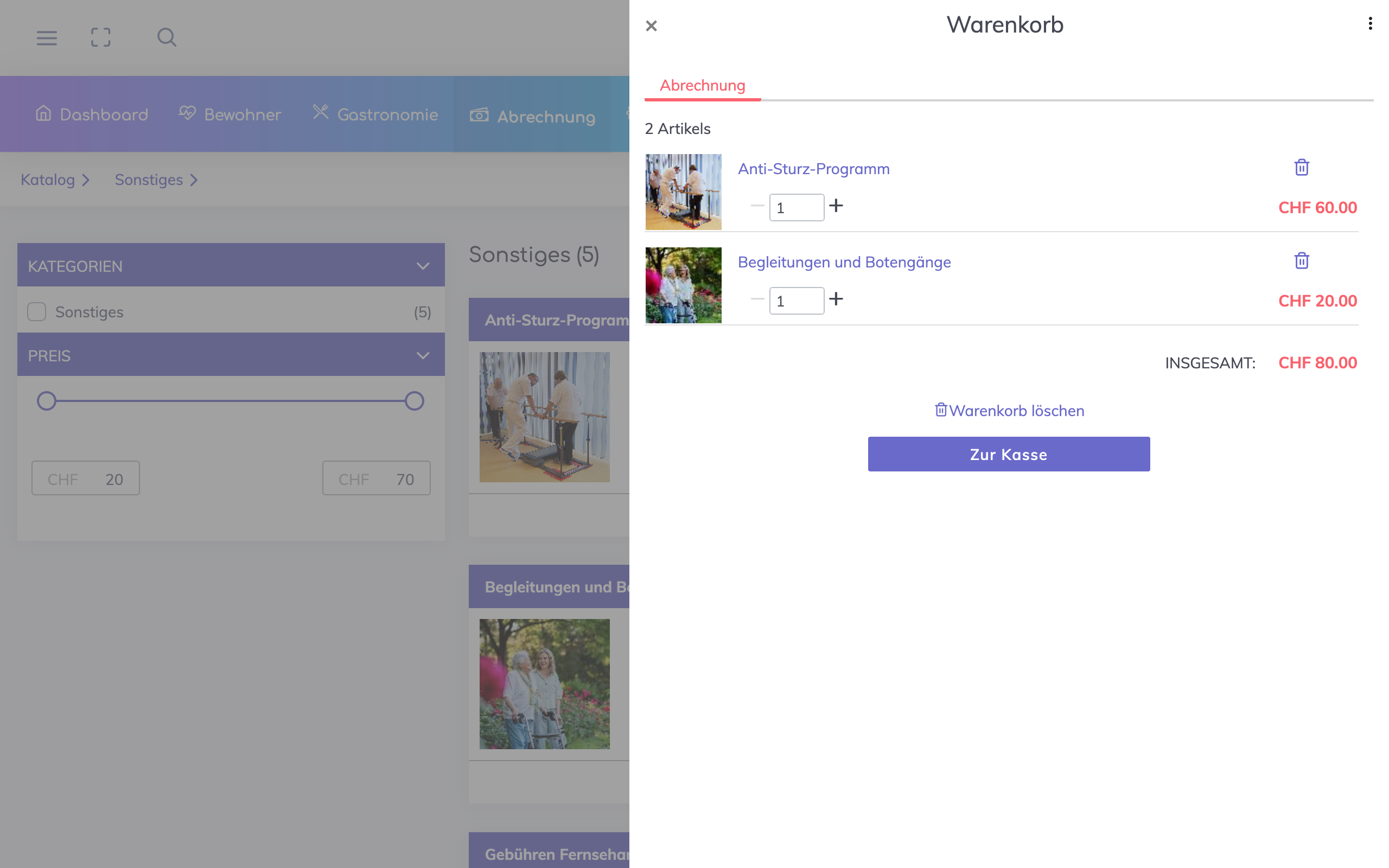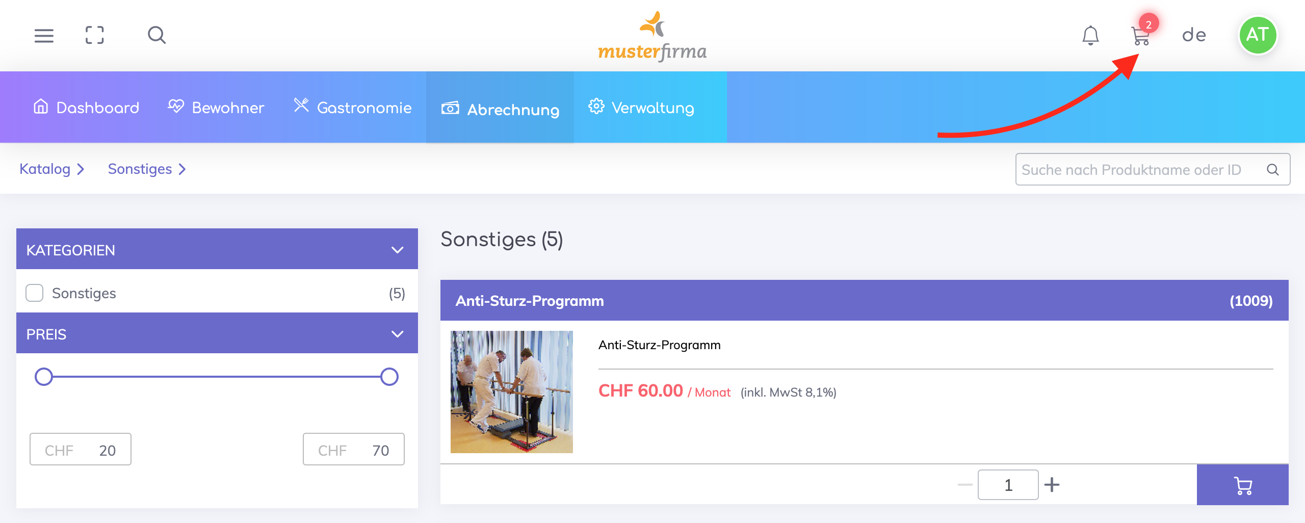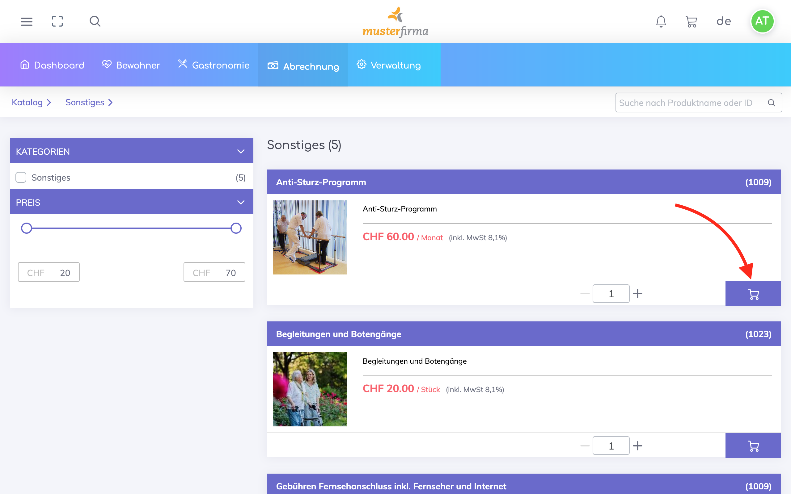 Wann wird diese Funktion verwendet?Nutzen Sie diese Funktion, wenn ein:e Bewohner:in eine Leistung oder ein Produkt bekommt (z.B. Transportdienste, Haarschnitte), das abgerechnet werden soll. Diese Artikel müssen schon vom Administrator im Produktkatalog eingerichtet worden sein.