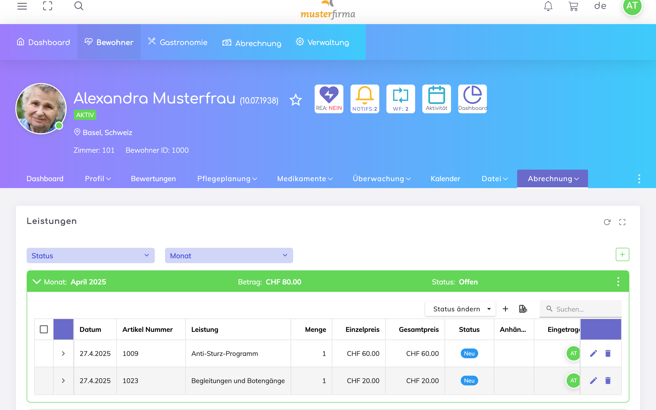 Du kannst Abrechnungseinträge jederzeit im Bewohnerprofil ansehen und bearbeiten.