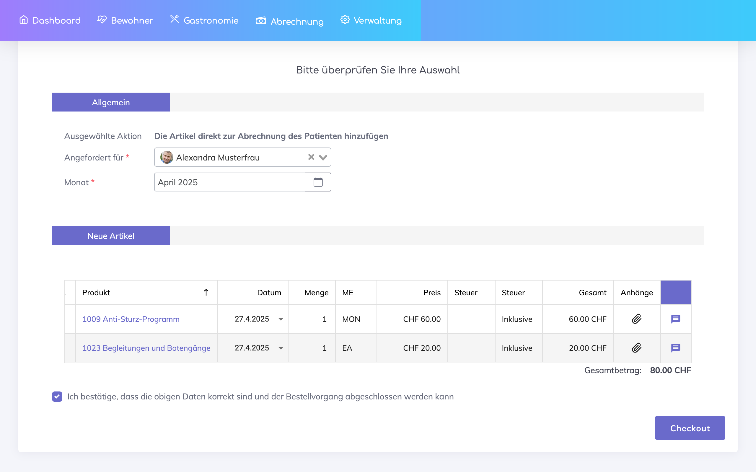 Klick auf „Checkout“ um den Eintrag zur Abrechnungsliste des Bewohners zu schicken.