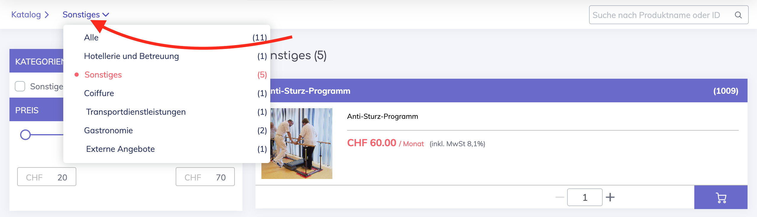 Wenn Sie mit der Maus über die aktuelle Kategorie fahren, wie gezeigt, werden die anderen Kategorien angezeigt. Klicke auf eine bestimmte Kategorie, um entsprechend zu wechseln, oder klicke auf Alle, um alle Produkte und Dienstleistungen anzuzeigen.