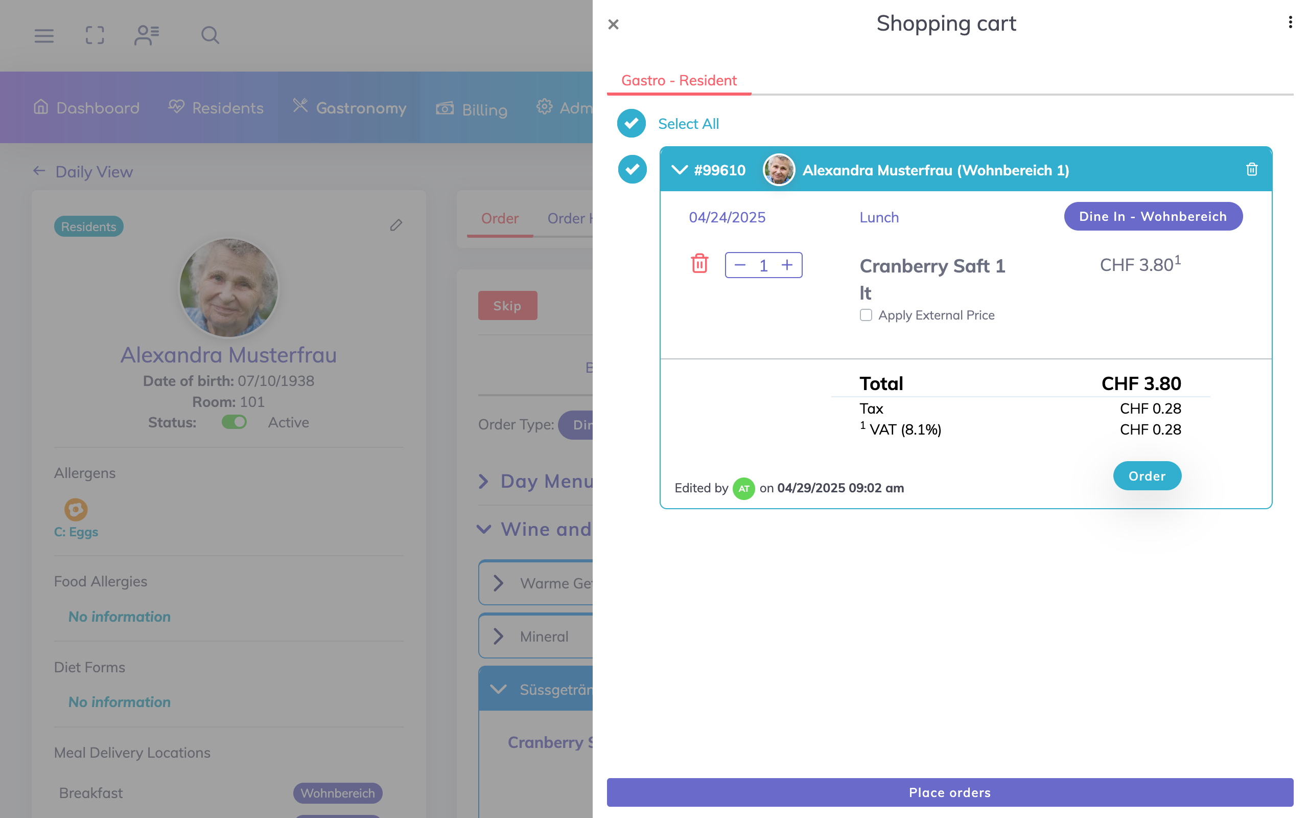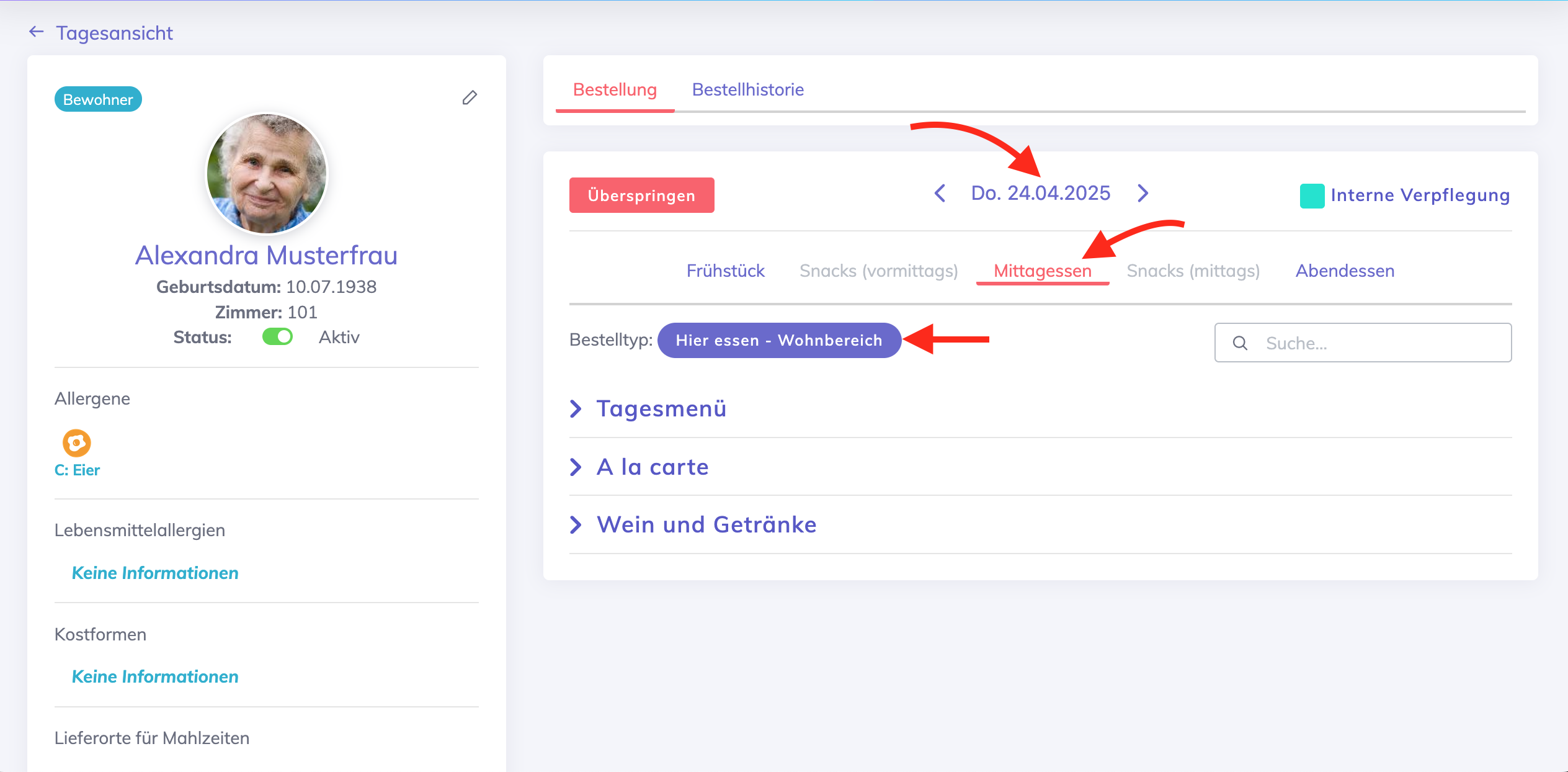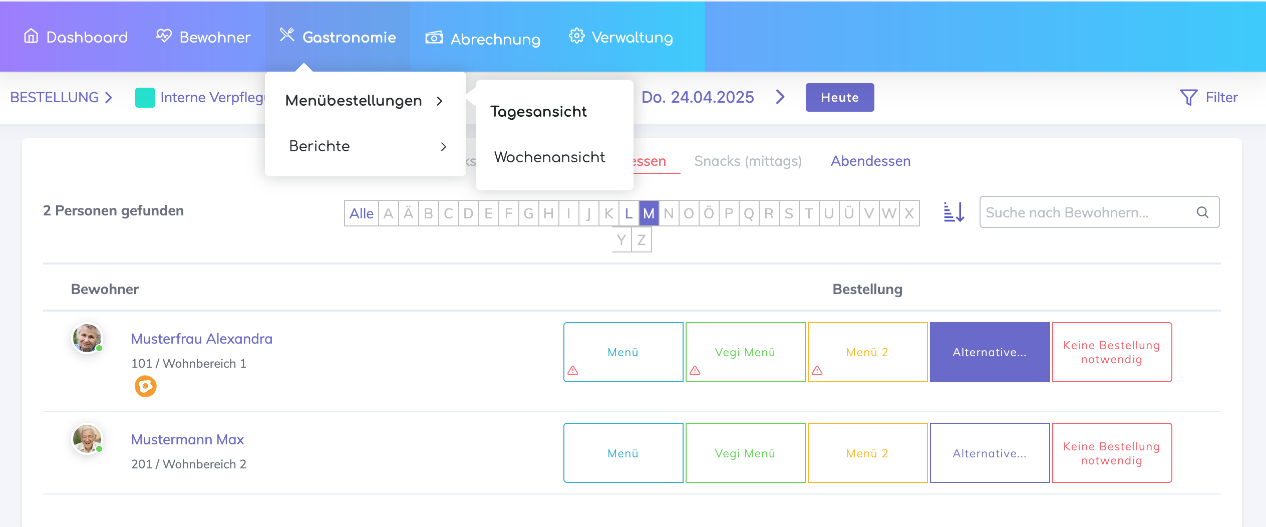 Geh zu den Menübestellungen für Bewohner:innen in der Gastro App.