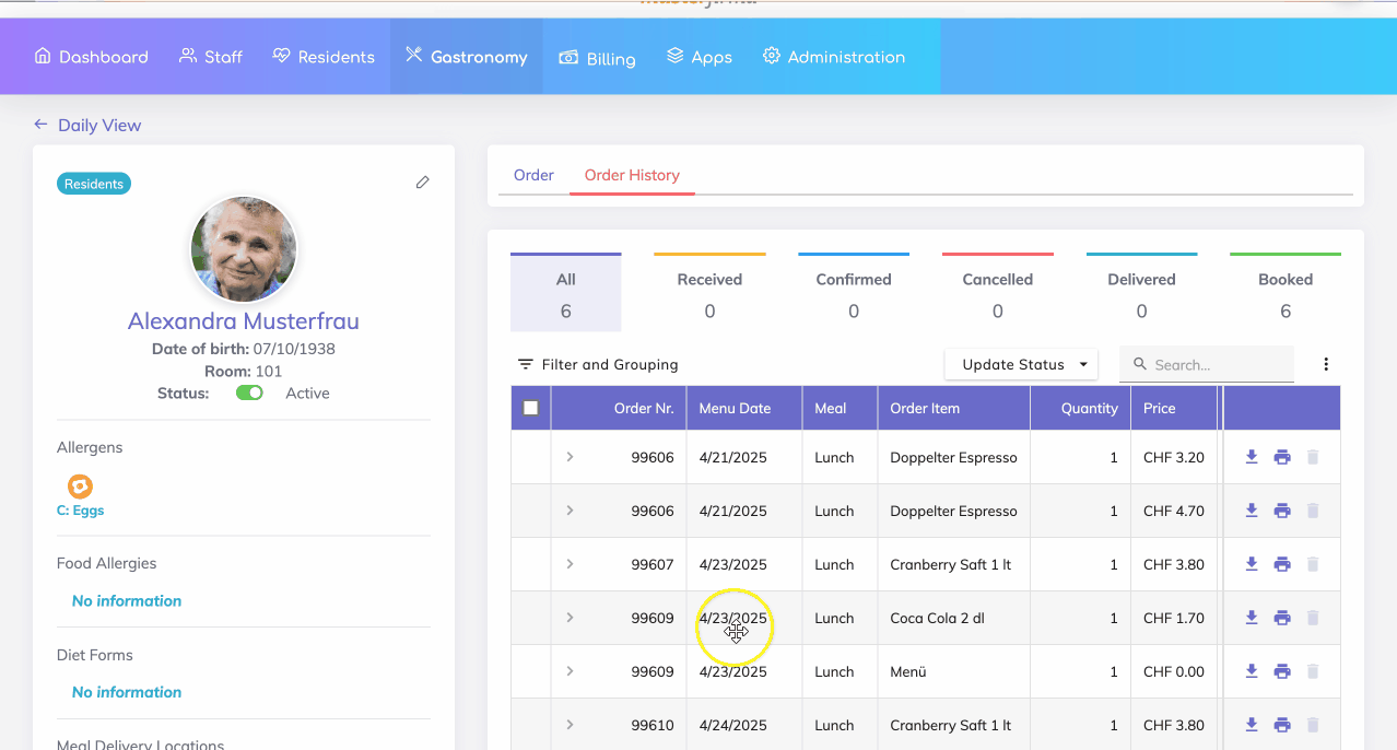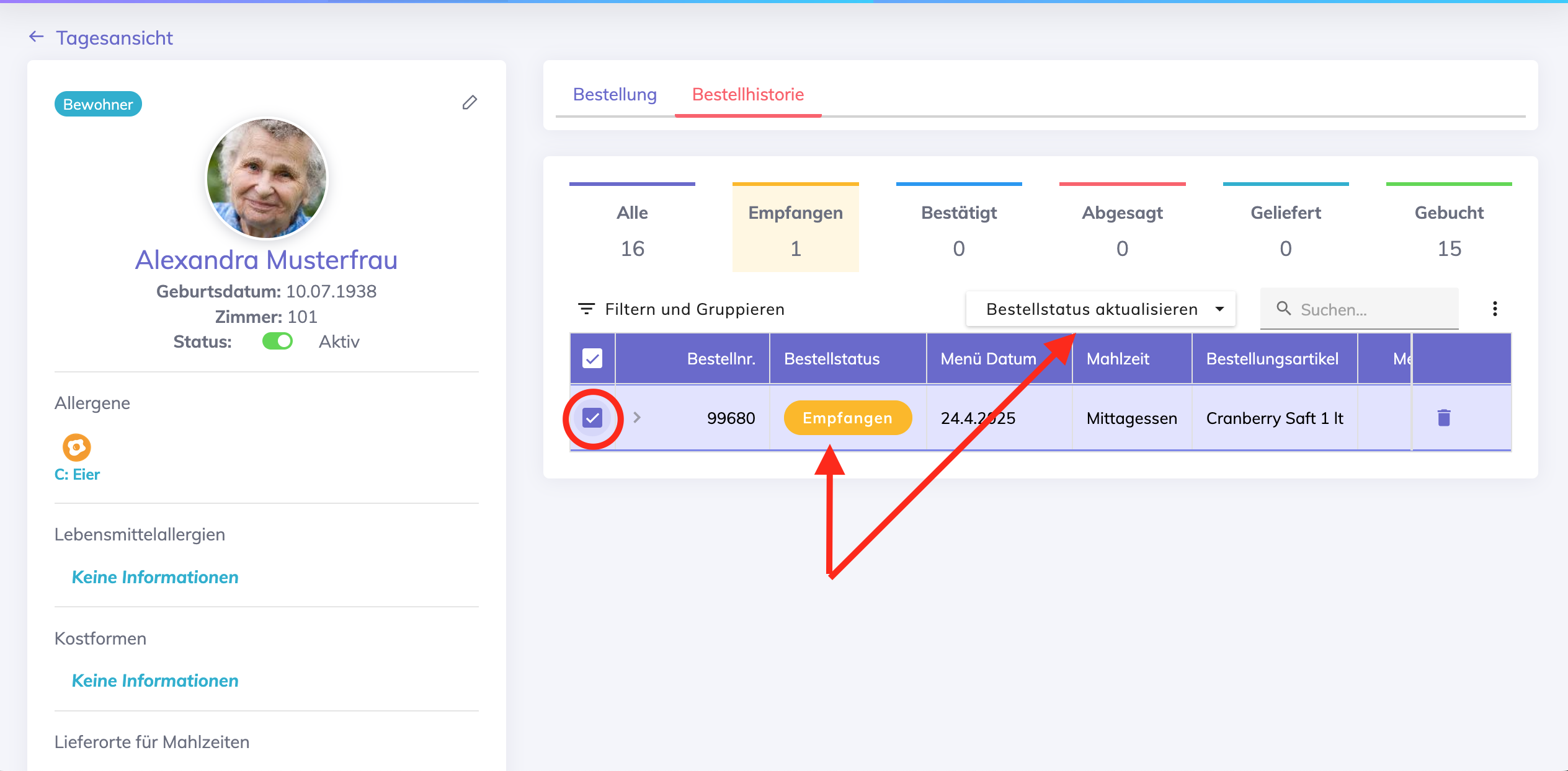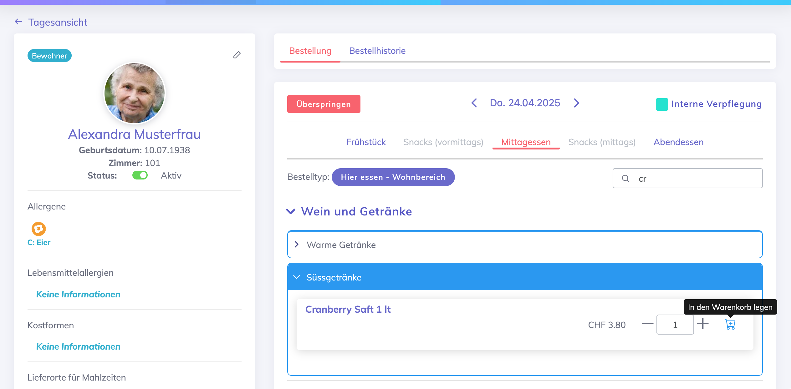 Geh zu den Menübestellungen für Bewohner:innen in der Gastro App.