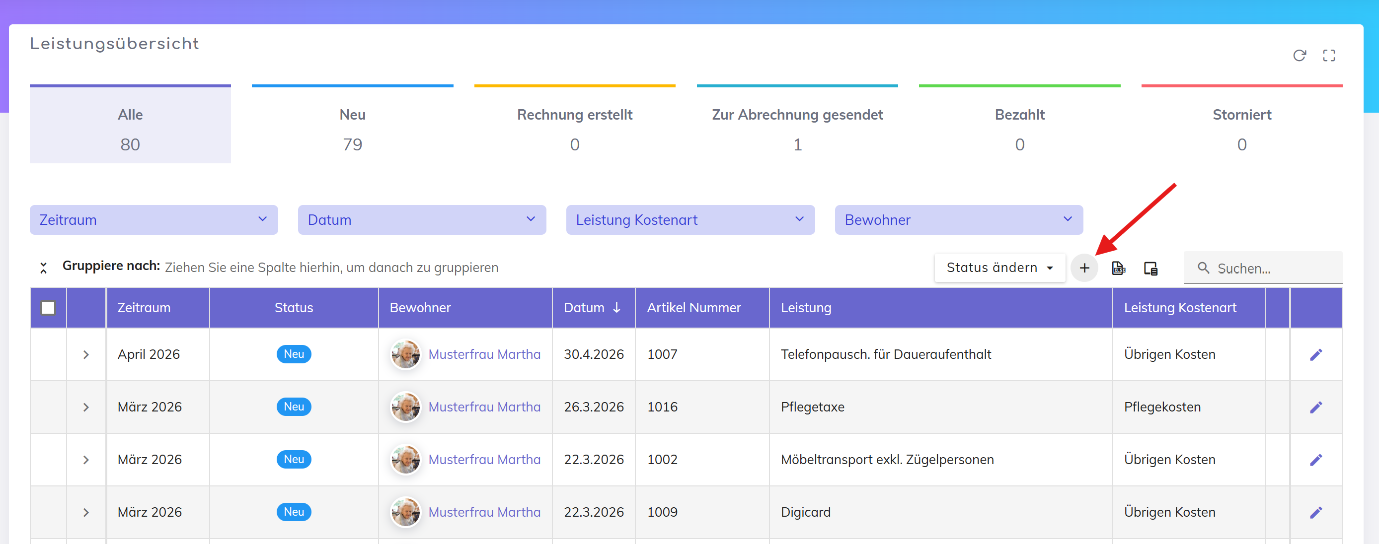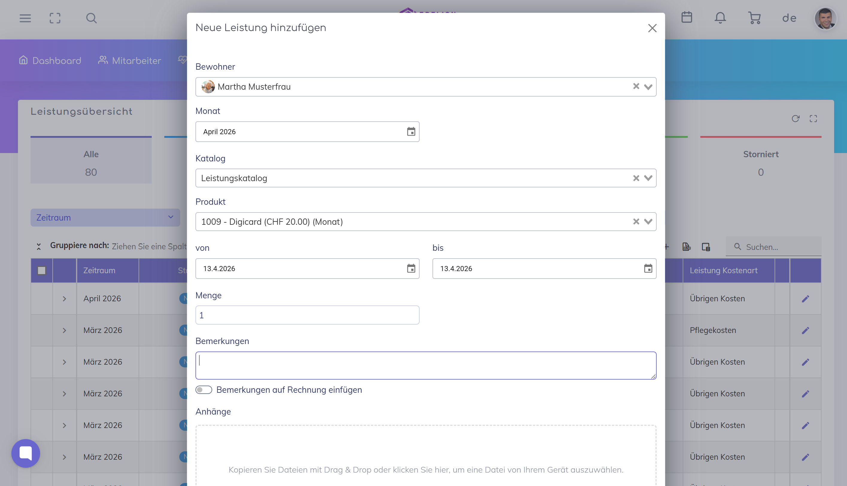 Füge eine Leistung direkt aus dem Bewohnerprofil zur Abrechnungsliste hinzu.