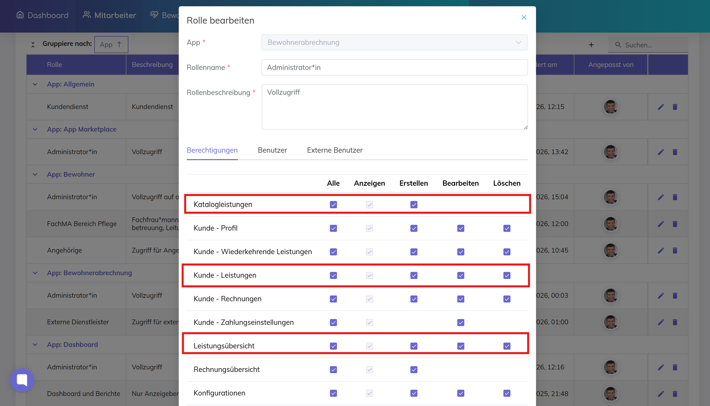 Ermöglicht das Erstellen und Bearbeiten von Leistungen für Bewohner.