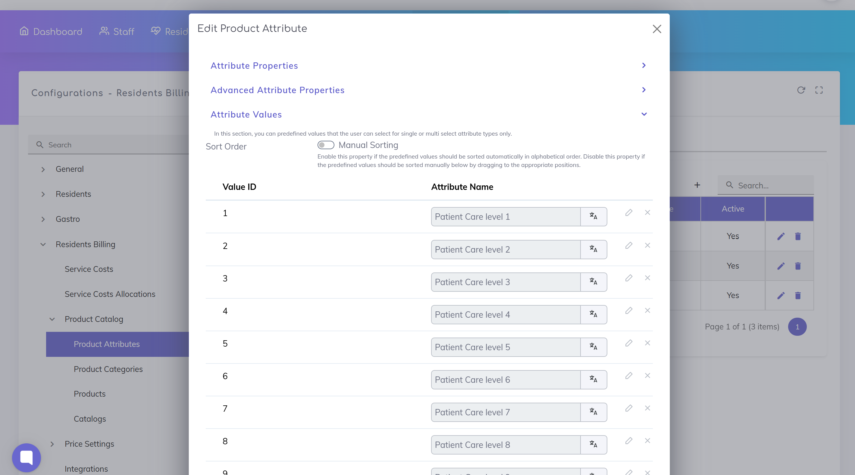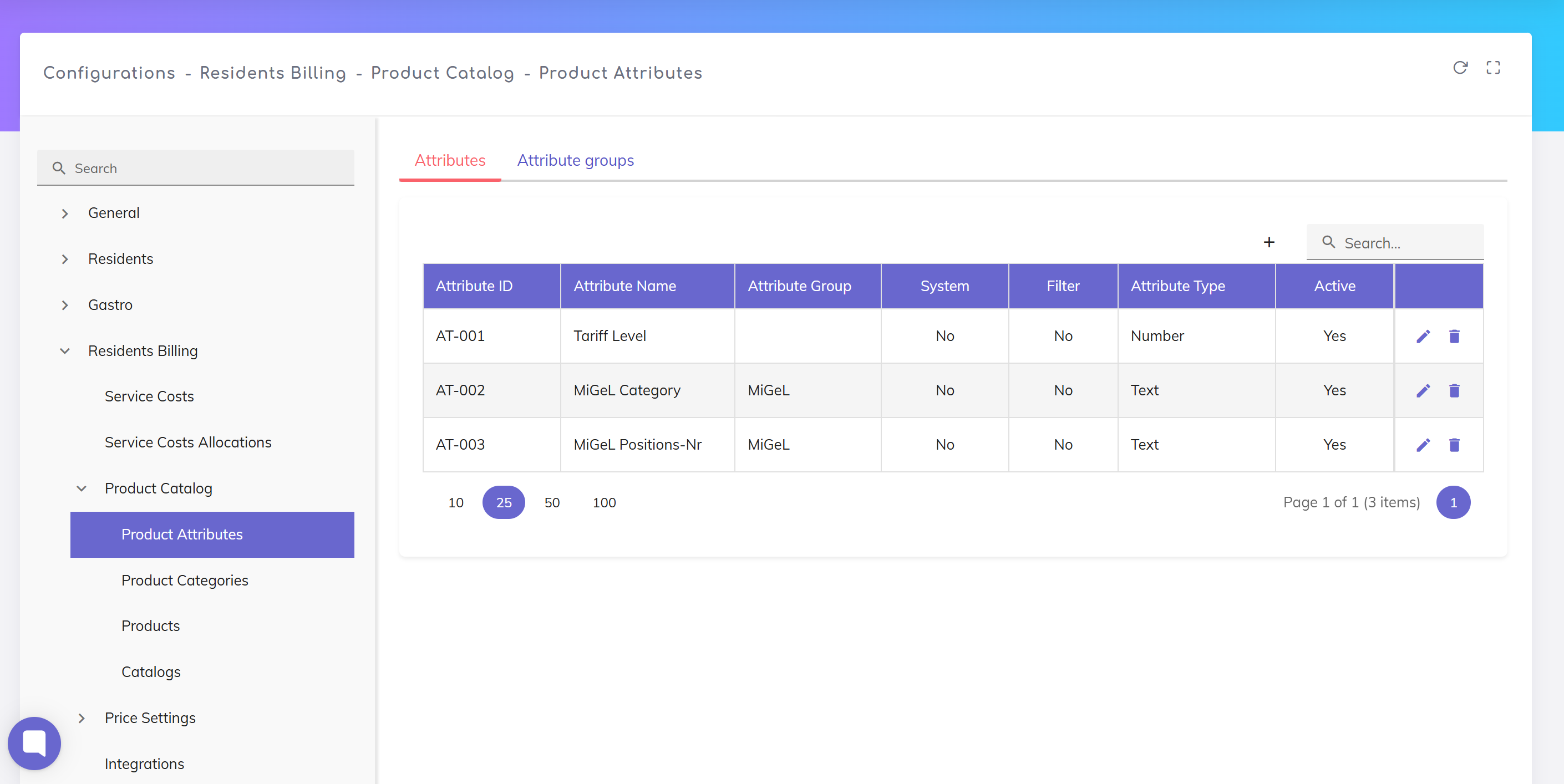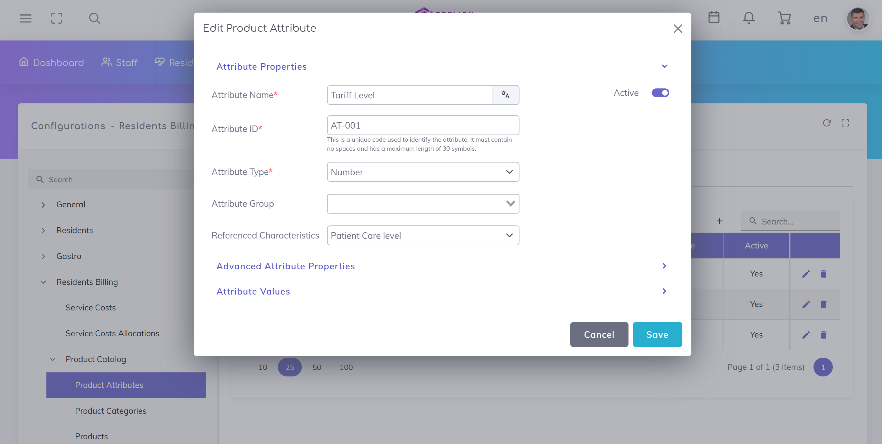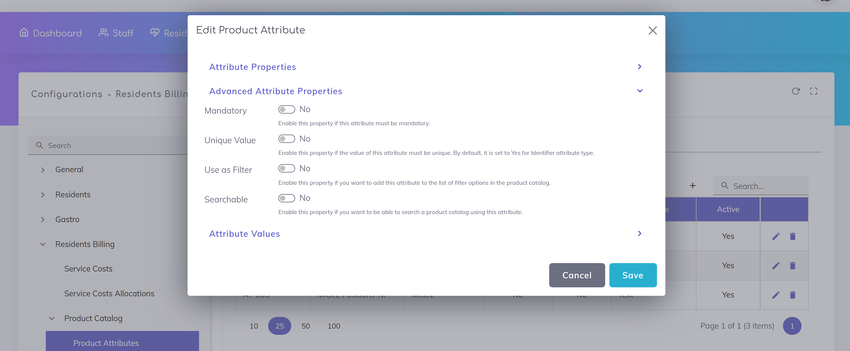 Step by Step: Configure Product AttributesAdministration → Configurations → Residents Billing → Product Catalog → Product Attributes